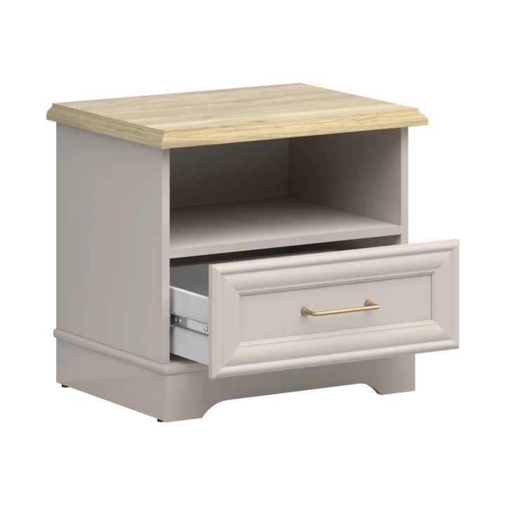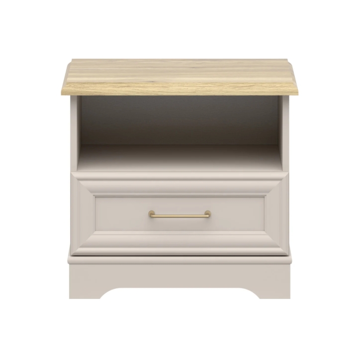 What makes the Anga bedside cabinet stand out is the combination of two trendy decors - beige kashmir with a warm mauvella oak colouring on the top. This makes the piece of furniture suitable for bright interiors decorated in japanese, modern or classic style. A distinctive accent is also the handle in brushed gold, which gives the whole piece a subtle expression and alludes to the other pieces in the Anga collection.