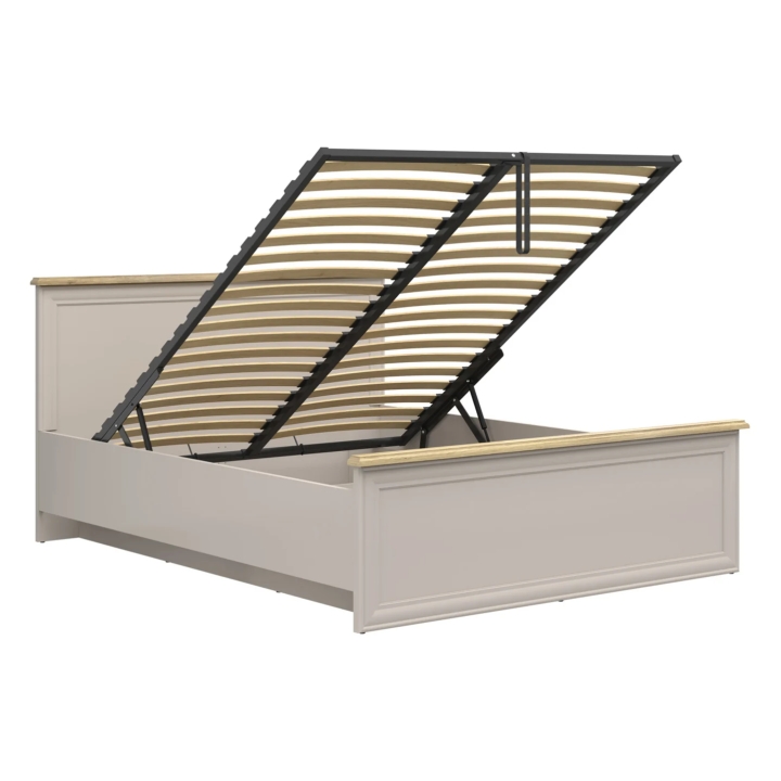 The frame is raised on gas cylinders, which makes everyday use easier. The bedding container is placed over the entire surface of the frame, which maximises storage space without the need for additional cupboards or boxes.