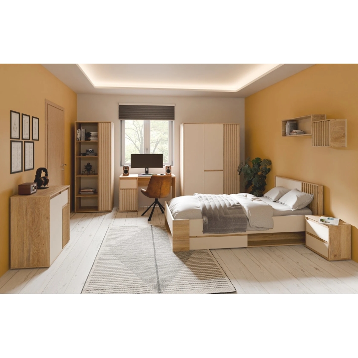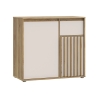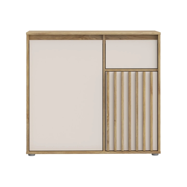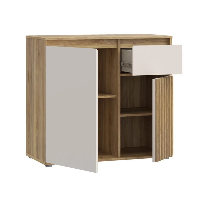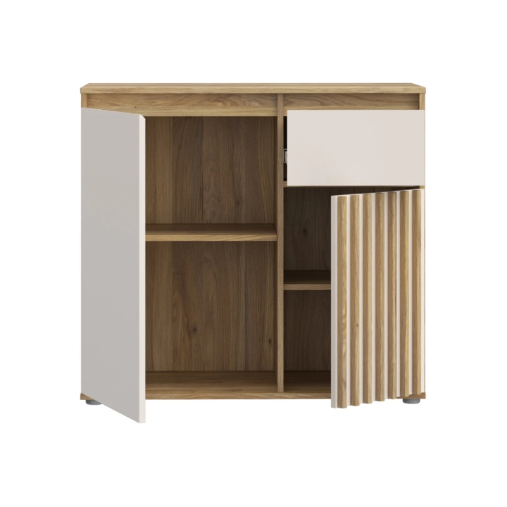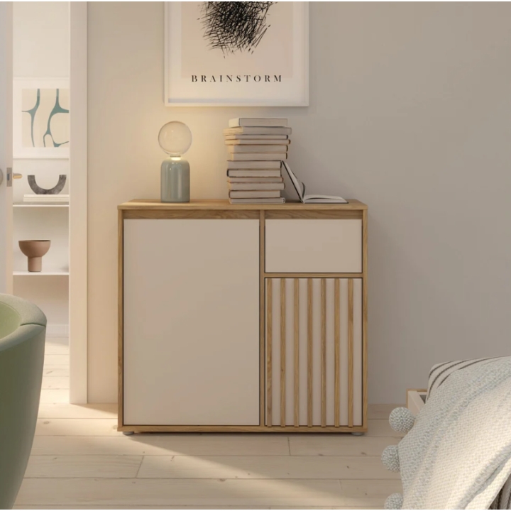 What draws attention is the panel with MDF slats, which is located on one of the fronts. It is an original detail that fits in with current trends and adds a decorative touch to the piece. The fronts and drawer open with a push-to-open system, which makes it possible to do away with handles altogether. The chest of drawers is also equipped with a soft-closing system, making it comfortable and noiseless to use.