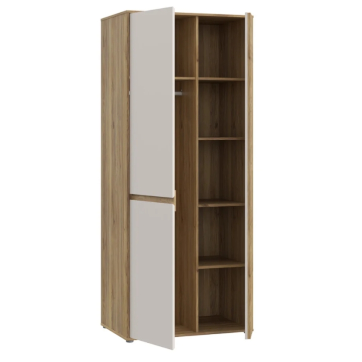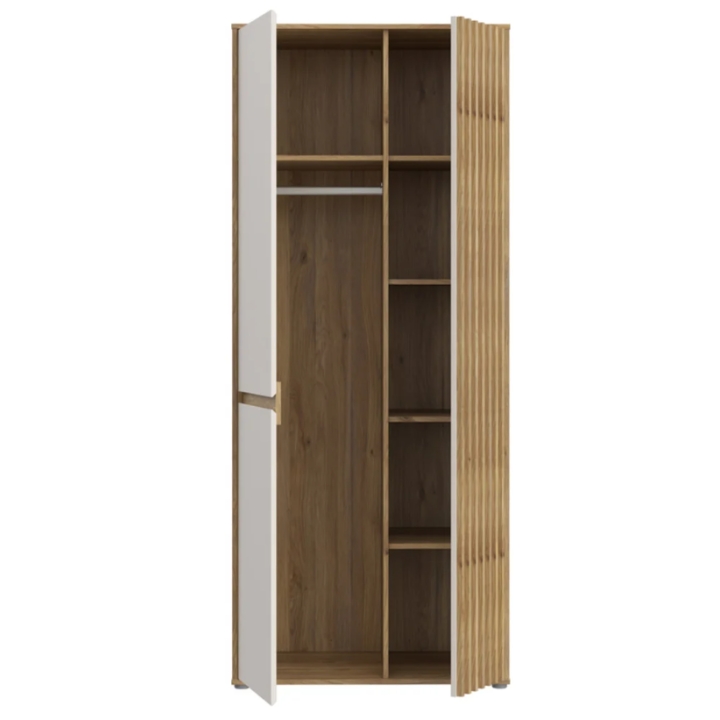 The Eliston 84 cm two-door wardrobe is the perfect choice for those in need of a compact but roomy piece of storage furniture. Its clever interior layout combines a clothes rail on the left side with five functional shelves on the right side - hidden behind decorative MDF slatted doors. This division provides optimum space for both a hanging wardrobe and folded clothes or home textiles.