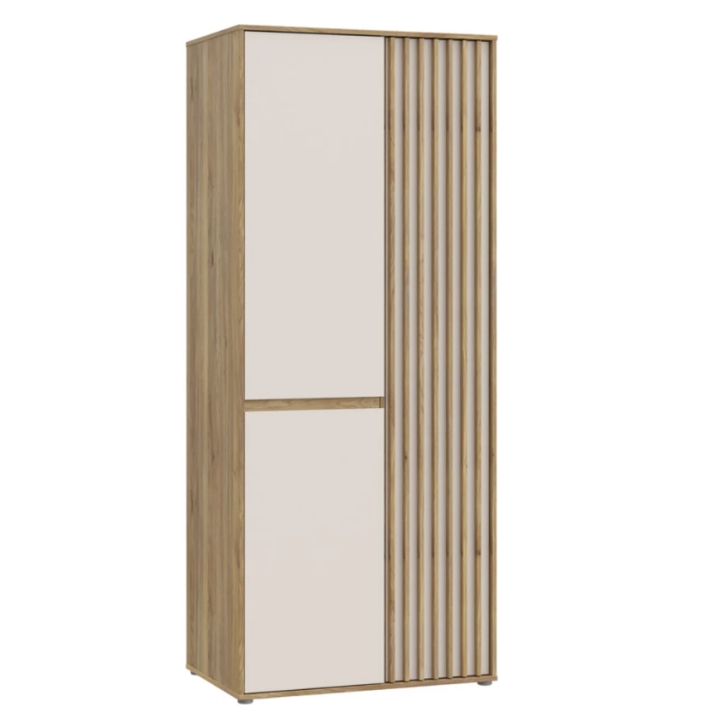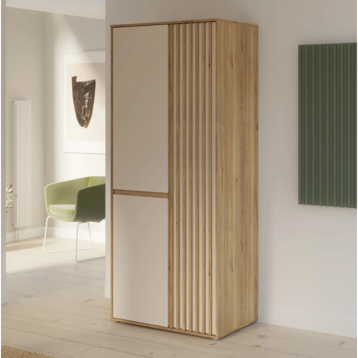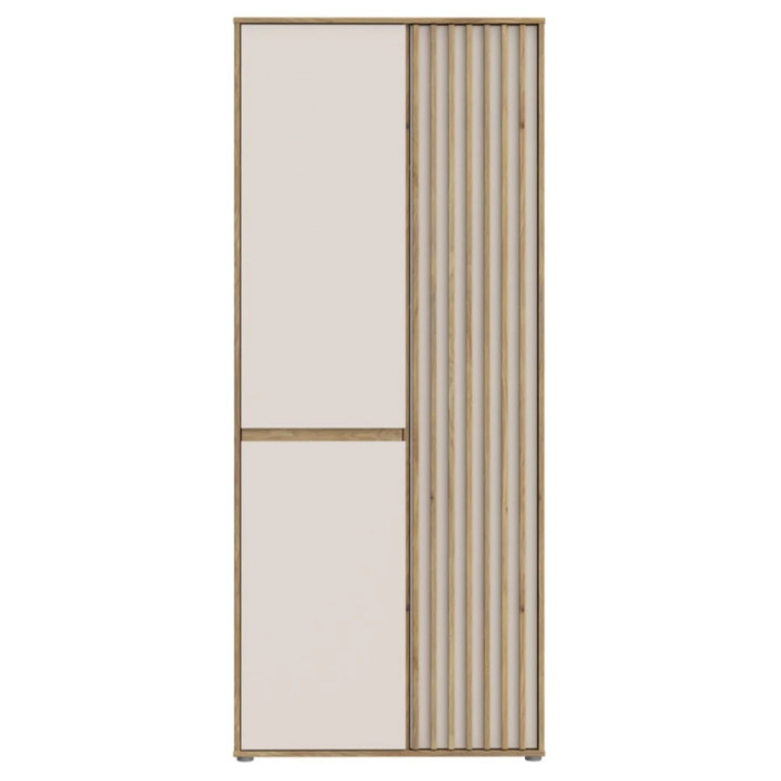 The modern design of the Eliston wardrobe is emphasised by the contrast of the warm mauvella oak shade with the light sand décor. The laths on the front introduce a decorative rhythm and give the piece a distinctive character. The push to open system eliminates the need for handles, which further enhances the minimalist style of the furniture and ensures comfortable use.