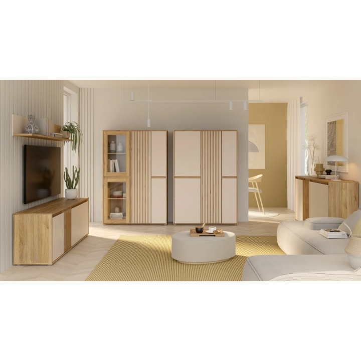 The left section of the furniture is equipped with a glass door, behind which you can place ornaments, photos, glass or porcelain. The middle and right doors made of furniture board conceal capacious shelves ideal for textiles, documents and even wardrobe items. Some of the fronts have been decorated with MDF slats, which adds to the overall look and fits in with the latest interior design trends.