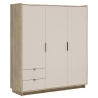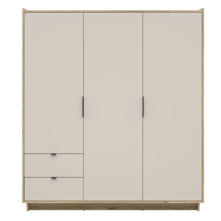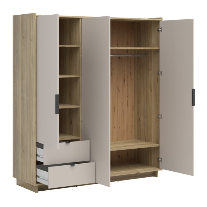 This is a piece of furniture designed with functional storage in mind. The three-door design conceals a clever division of space: on the left side you will find a hanger bar for coats, jackets or shirts, with a shelf above it for seasonal accessories. On the right side, you will find further shelves for folded clothes such as jumpers, trousers or towels. The whole is completed with two capacious drawers in the lower part of the furniture, which will be perfect for storing linen and accessories.