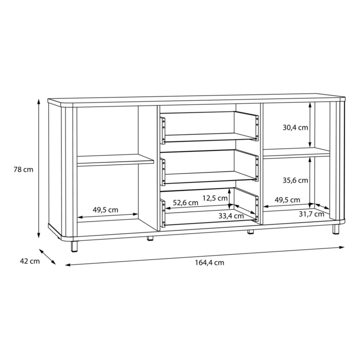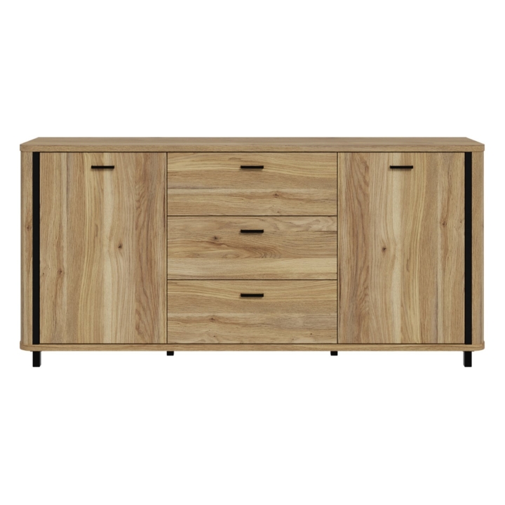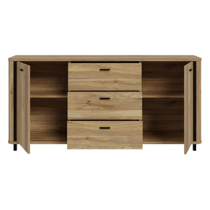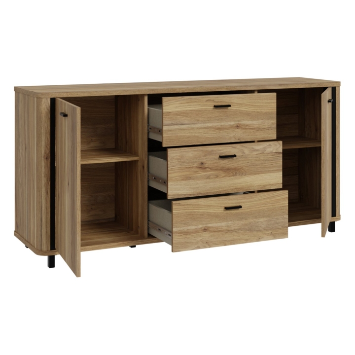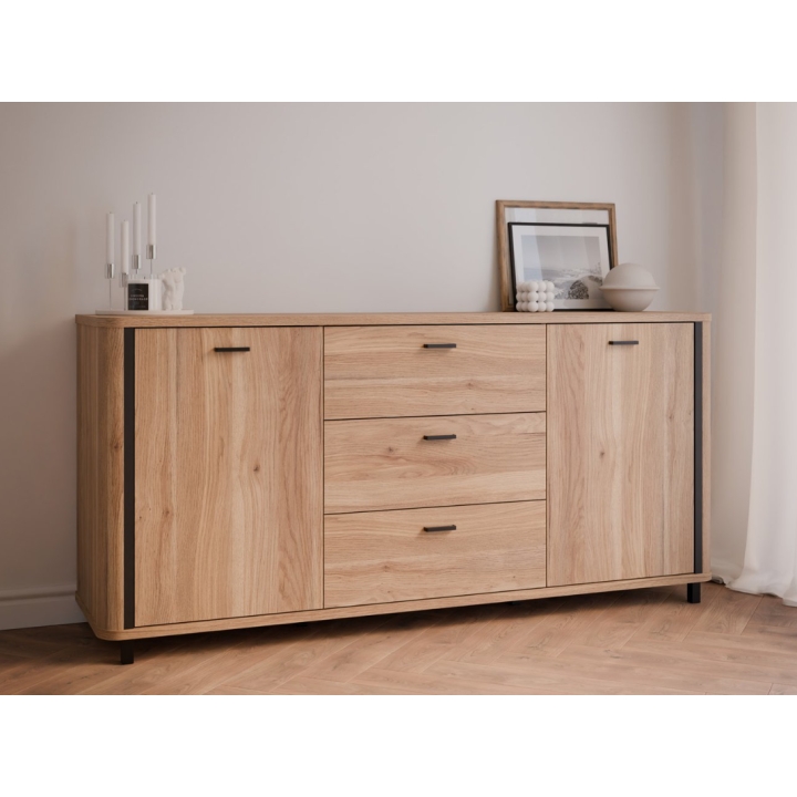 The Falam chest of drawers has been designed with maximum usability in mind. The central section features three roomy full-extension drawers with a soft-closing mechanism for easy storage and tidiness. The sides feature two spacious cabinets with shelves - ideal for textiles, documents or board games. An additional advantage is the wide top, on which you can display decorations, photos or plants.