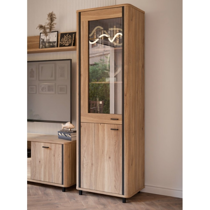 The display is distinguished by the natural colour of mauvella oak, which gives the space a cosy atmosphere. Black details - in the form of handles, slender legs, side slats and rounded sides - give it a modern, slightly loft-like character. They give the unit a stylish, but not overpowering look.