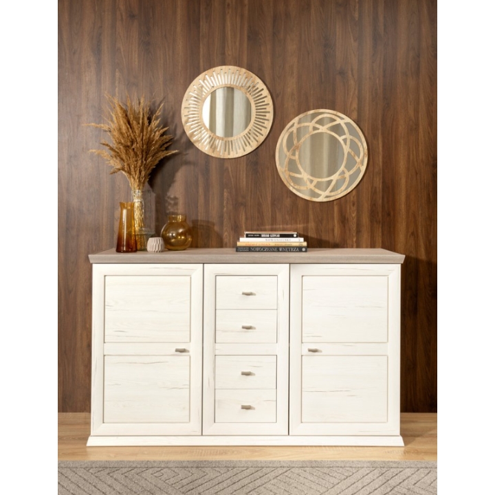 The Camron 150 cm chest of drawers is a piece of furniture that will be perfect for any interior where order and balanced style are important. Its construction is based on a system of four drawers and two side cabinets equipped with shelves. Such a solution allows you to conveniently organise your wardrobe, documents, textiles or small accessories, while also offering display space on the wide top.