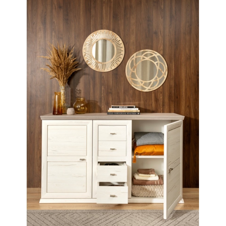 The body and fronts of the Camron chest of drawers are made of durable furniture board, ensuring solidity and resistance to everyday use. Silent closing and full-extension systems increase the comfort of the drawers and doors, eliminating noise and resistance when opening.