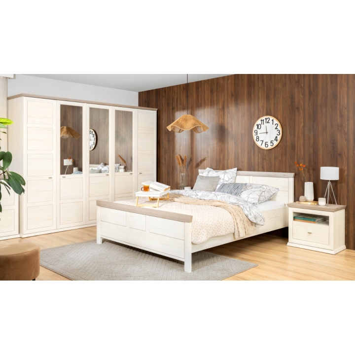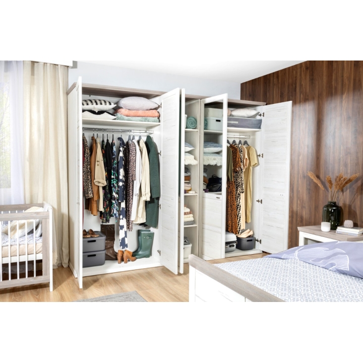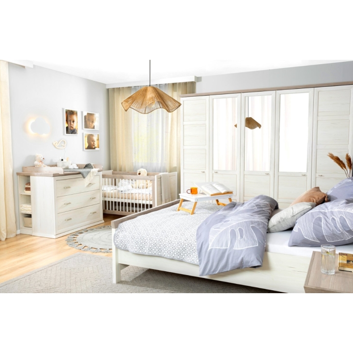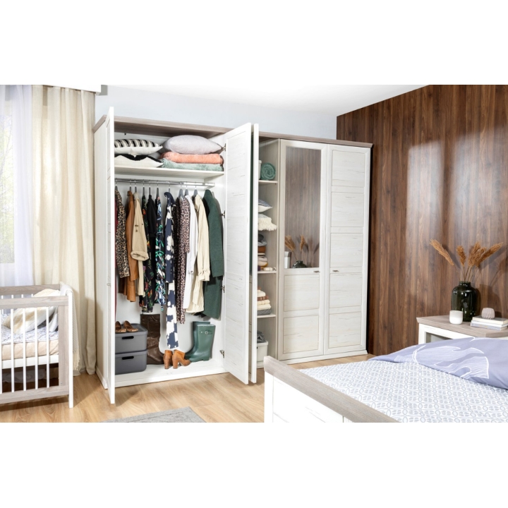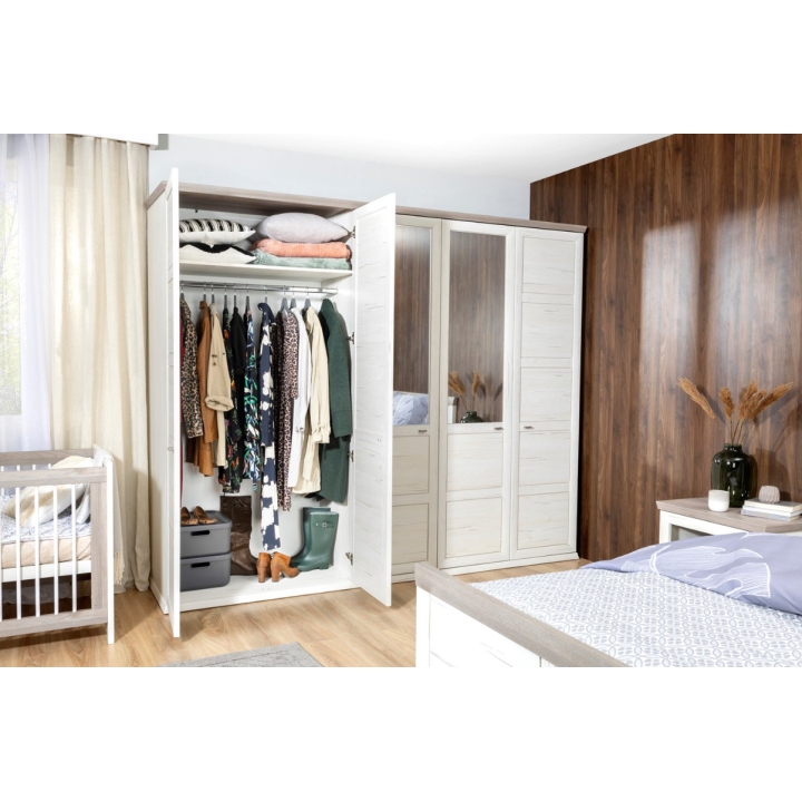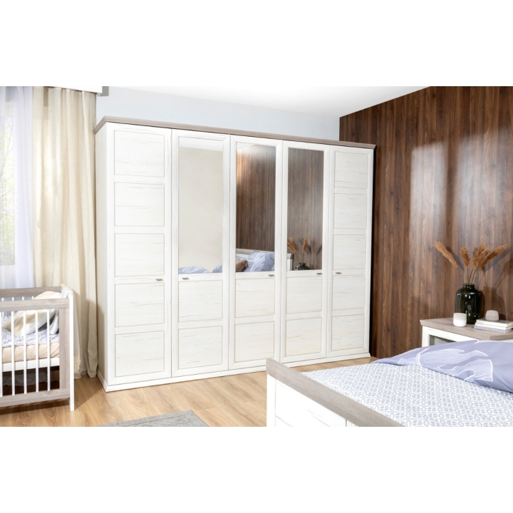 Three of the five fronts have been fitted with mirrors, which not only makes it easier to select clothes on a daily basis, but also reflects light and optically enlarges the room. This is particularly important with the large size of the furniture, which, thanks to its light aurelio pine colouring, does not overwhelm the interior. The natural texture and the Madagascar-coloured top create a harmonious duo inspired by the calm atmosphere of rustic and classic arrangements.