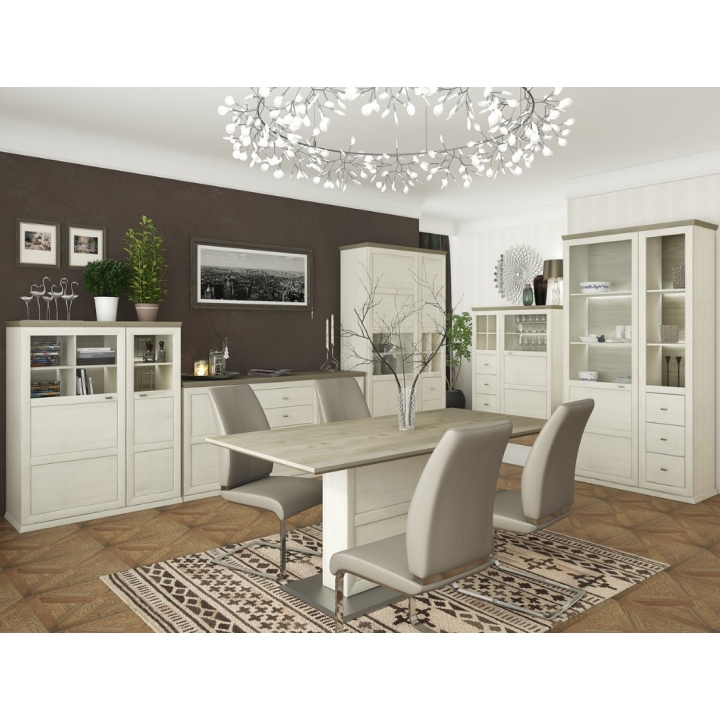 The lower part of the cabinet is equipped with shelves closed behind full fronts, which makes it easier to organise everyday things - documents, textiles or accessories which do not necessarily have to be in view. The entire cabinet is designed in a light aurelio pine décor, which introduces lightness and visual warmth. In contrast, there is a top panel in a darker shade of madagascar, which adds a distinctive touch to the furniture. The milled fronts and delicate handles emphasise the rustic-inspired style, but the display cabinet will also work well in more contemporary settings.