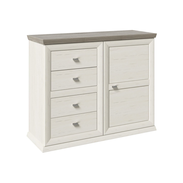 This piece of furniture offers four drawers and a cupboard with shelves that allow you to organise documents, clothes, accessories or a supply of bedding with ease. The wide top becomes a place to display accessories - lamps, candles, photo frames or potted plants. The well-thought-out layout of the storage compartments facilitates everyday organisation without the need to compromise.