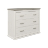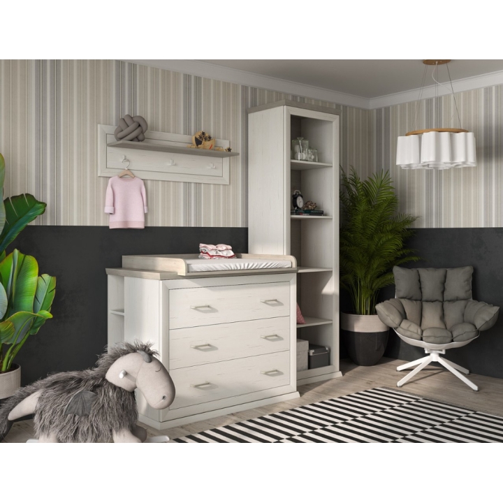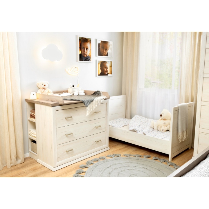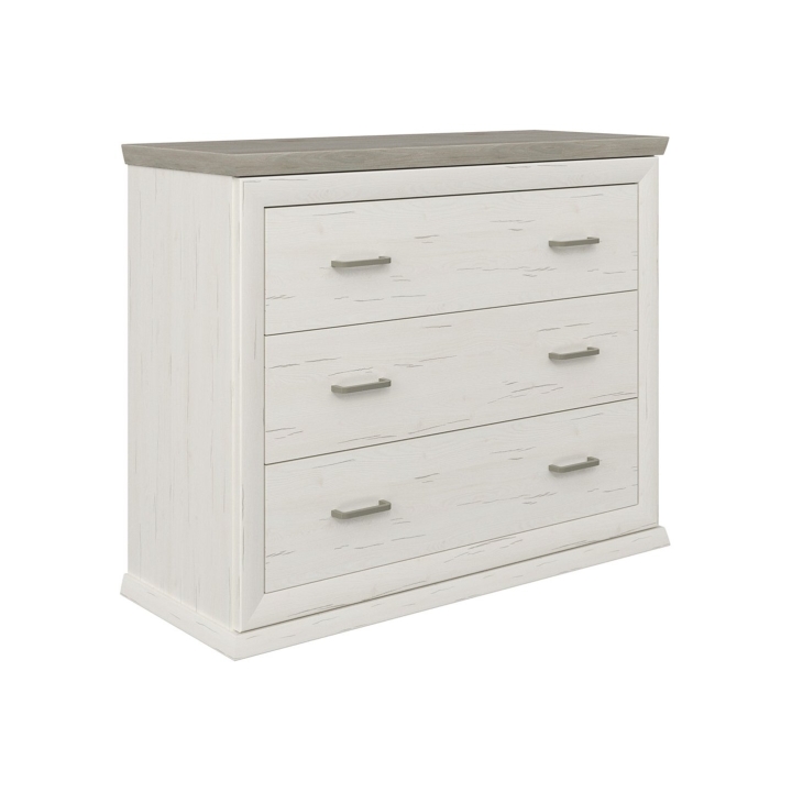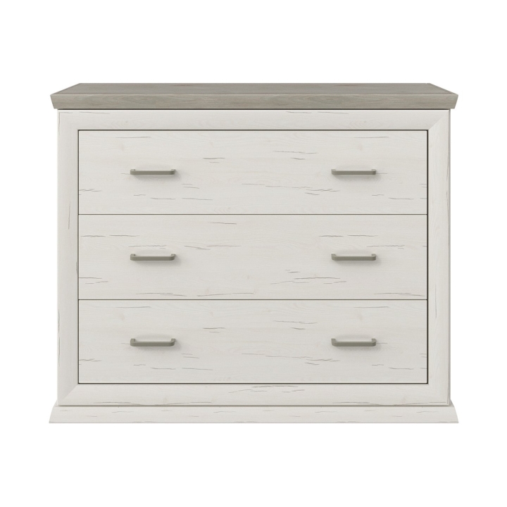 The finish of the chest of drawers is based on the Aurelio pine décor, which reproduces the natural grain of light wood. In contrast, the top is Madagascar grey-brown, a deeper colour that better masks the marks of daily use. This colour duo suits both classic interiors and those inspired by cottage, vintage or minimalist styles.