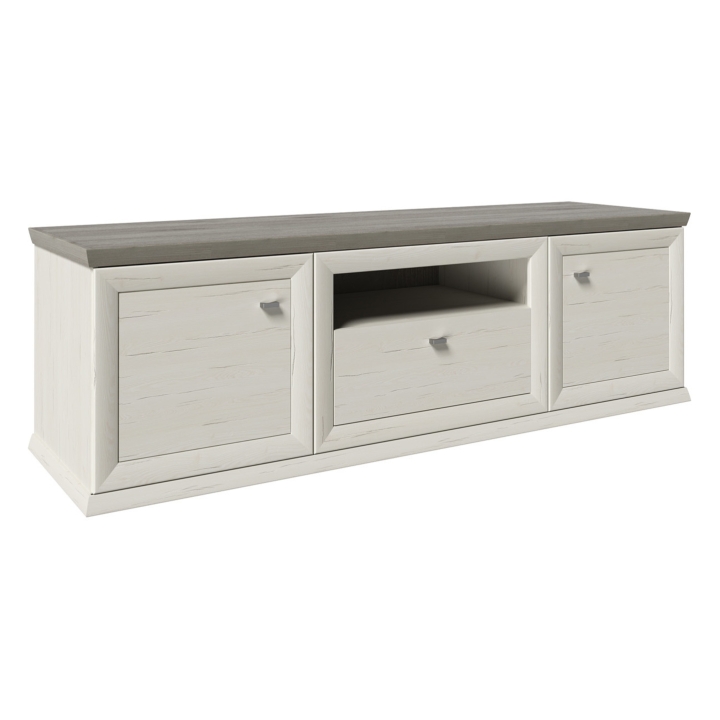 The central part of the cabinet is an open shelf - perfect for a set-top box, console or soundbar. Just below it is a capacious drawer where you can store remotes, documents or chargers. The sides are flanked by cabinets with doors - each with an internal shelf to hold discs, newspapers or cables of all kinds.