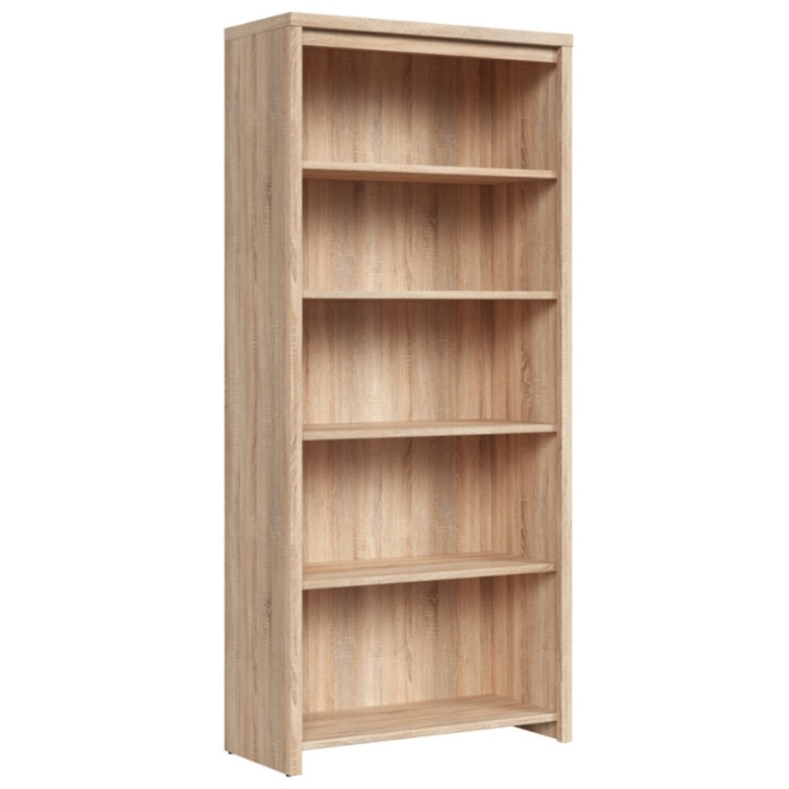 The Kaspian open bookcase by Black Red White, measuring 90 × 200.5 × 40.5 cm, is a five-level piece of furniture designed for storage and display. Made of furniture board in the colour of oak sonoma, it is characterised by its natural look and neutral colouring that fits into many arrangements. Five open shelves provide easy access to the contents - books, documents, decorations or home accessories. The regular arrangement of the shelves makes it easy to organise the space, and the tall design maximises vertical space. Bold sides reinforce the body and add to the overall look. The depth of 40.5 cm also allows for storage of larger formats. The bookcase weighs 53.2 kg, which contributes to its stability. The model can function independently or as part of a larger set from the Kaspian collection, including chests of drawers and display cabinets. The product comes from Poland and has been made with attention to durability and aesthetics.