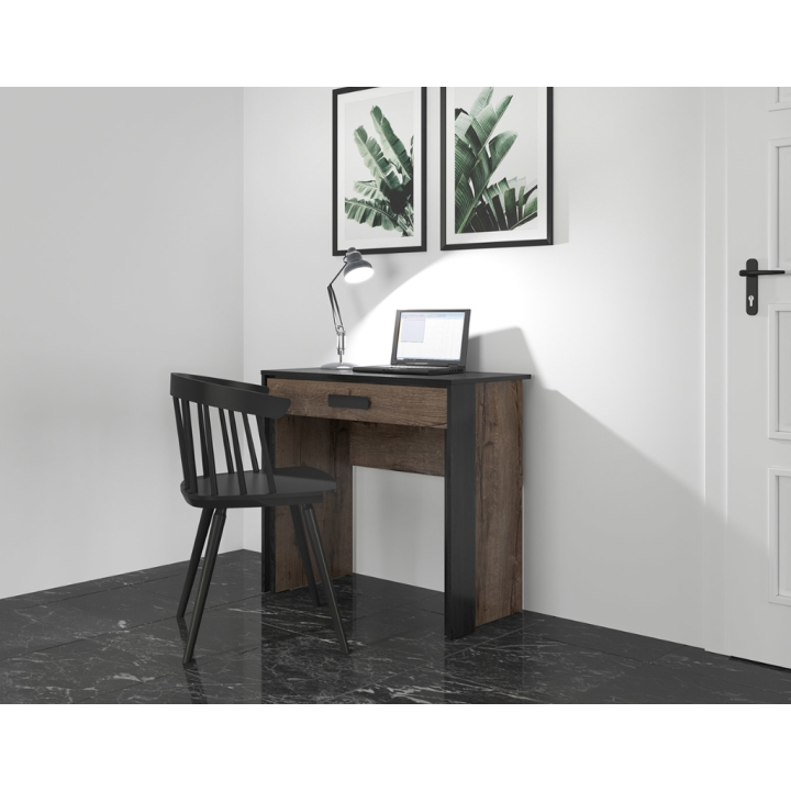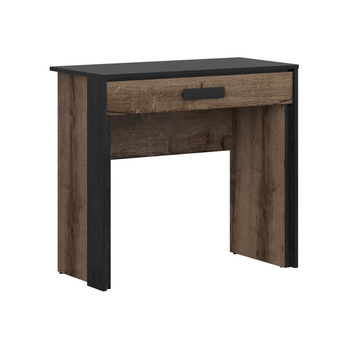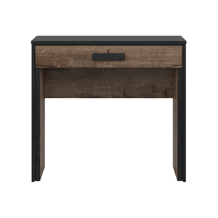 The Kassel toilette by Black Red White, measuring 85 × 41 × 77 cm, is a compact piece of furniture that will work as both a make-up area and a small work desk. Made of furniture board in oak monastery décor with accents in oak black, it combines the visible structure of the wood with the contrasting black to create a coherent whole that fits in with the modern and loft style. A capacious drawer under the top makes it easy to organise cosmetics, stationery or chargers. The 85 cm long top offers enough space to comfortably lay out a laptop, mirror or organiser. The height of 77 cm ensures comfort when seated. The low weight (20.9 kg) allows the furniture to be easily moved. The Kassel dressing table blends well with the other pieces in the collection - chests of drawers, wardrobes and beds - allowing you to create a coherent arrangement in your bedroom or dressing room.