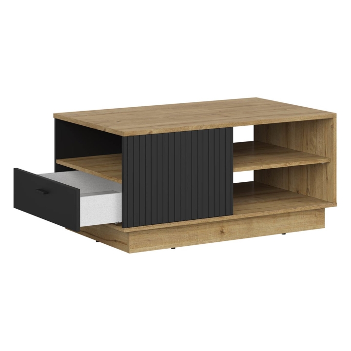 Zenda is made of durable furniture board, which guarantees its resistance to daily use. Its sturdy construction - with a length of 100 cm, a width of 60 cm and a height of 48 cm - makes it perfect for a larger living room as well as more compact spaces. A distinguishing feature is the decorative panels with milling, which imitate fashionable laths - this detail adds an original character to the furniture and perfectly fits in with current interior trends.