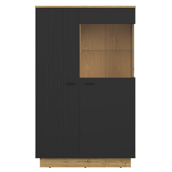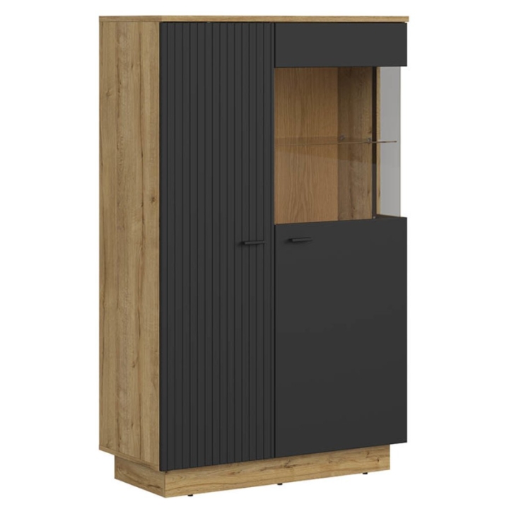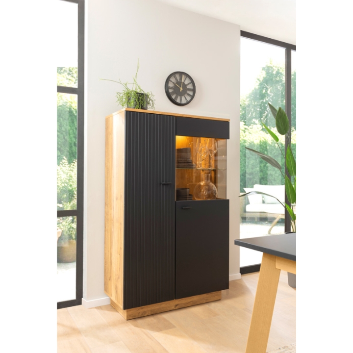With a width of 90.5 cm, a height of 146.5 cm and a depth of 42 cm, the design provides optimal proportions for rooms of varying size - from spacious living rooms to smaller studies or corridors. Made of durable furniture board and complemented by glass elements, the display cabinet guarantees durability and comfort in everyday use. Integrated metal handles emphasise the modern character of the solid, while original milling imitating slats introduces a three-dimensional effect which draws the eye and gives depth to the furniture.