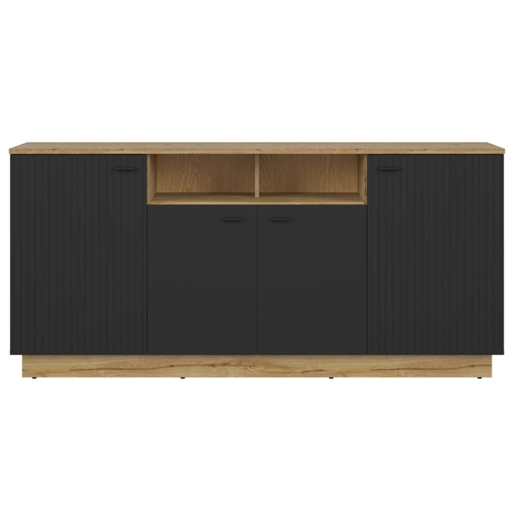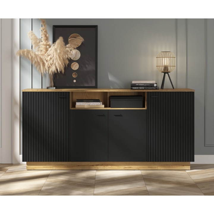 The Zenda 180 cm chest of drawers with four doors and an open shelf is designed for storing the things you want to keep within reach but not in plain sight. Behind the four fronts you will find plenty of space to organise clothes, documents, dishes or textiles. This is the solution for people who want to get rid of clutter in the living room or bedroom once and for all.