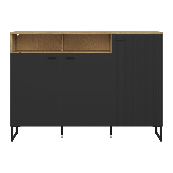 The Zenda 150 cm chest of drawers with three doors, an open shelf and metal legs is a piece of furniture that responds to real needs: storing things in an enclosed space, easy cleaning under the furniture and a distinctive look that does not get lost in the background.