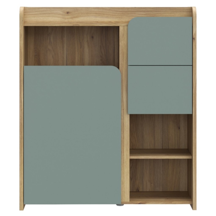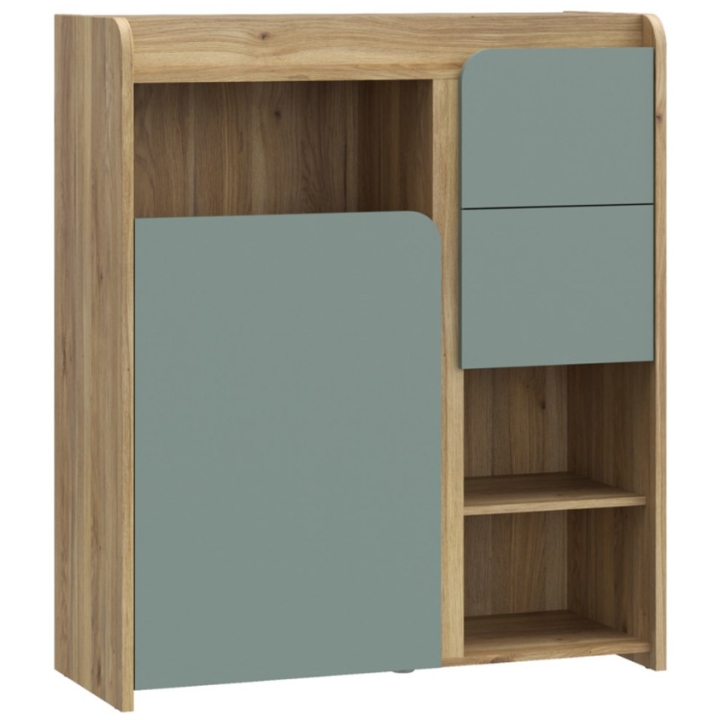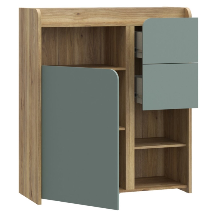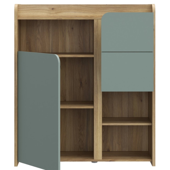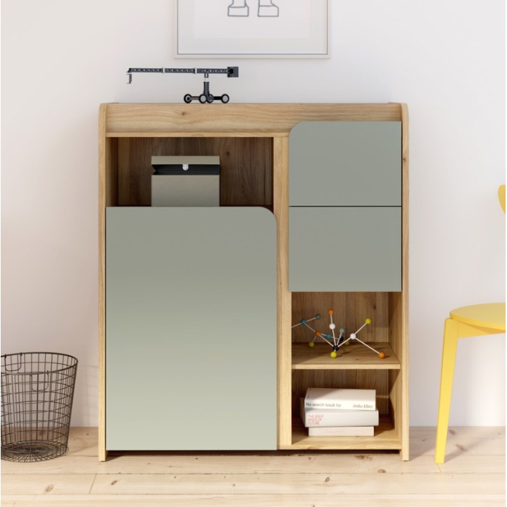 The strong point of this chest of drawers is its colour scheme. The carcass in mauvella oak décor brings a naturalness and visual warmth to the interior, while the fronts in sage shade break the classic with a modern, subdued accent. This colour duo is ideal for boho, Scandinavian, loft and eclectic interiors, bringing a touch of calm and freshness.