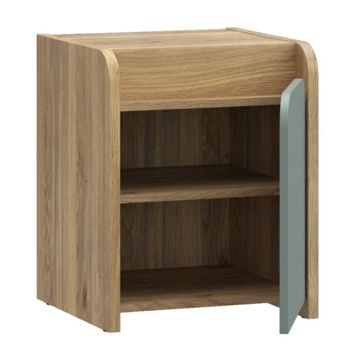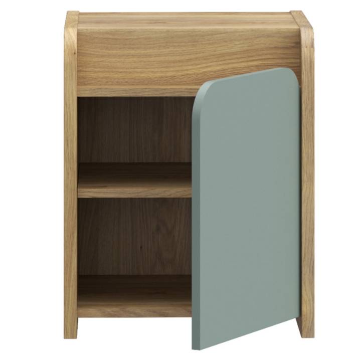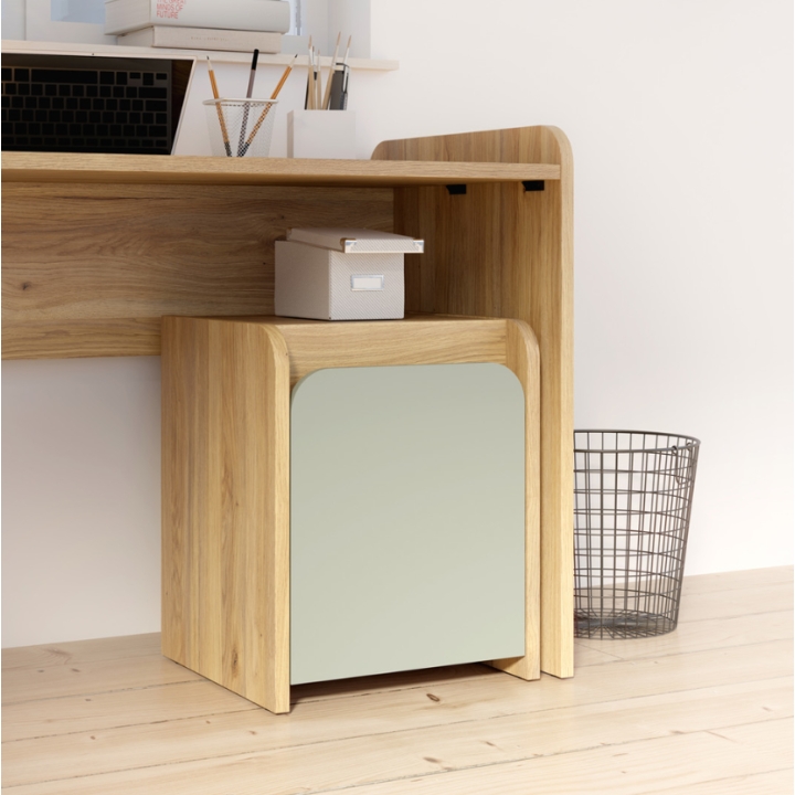 The solid colour is mauvella oak, which warms up the interior and gives it a pleasant, natural feel. The sage-coloured front creates a consistent and subdued colour combination with other furniture from the Hoa collection. Thanks to this colour scheme, the pedestal looks good not only as part of a set, but also as a standalone element in a youth room.