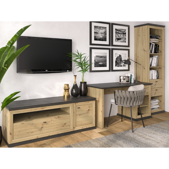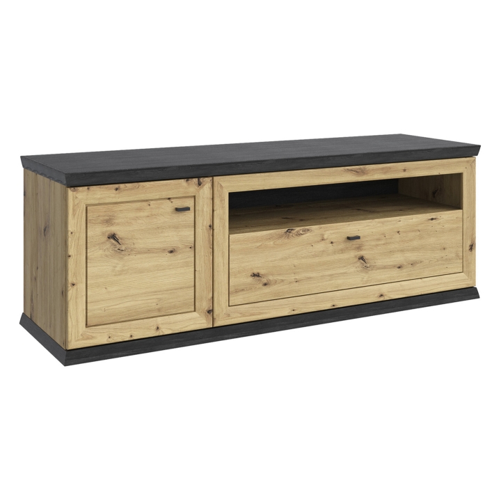 In terms of appearance, the Benton RTV cabinet is distinguished by the striking combination of the warm artisan oak décor, which resembles the texture of natural wood, and the dark delios colour present on the tabletop and base. It is this contrast that makes the furniture look more elegant and distinctive. The delicate milling on the front adds character without overwhelming the piece, and the low, solid proportions fit well in both modern and classic interiors.