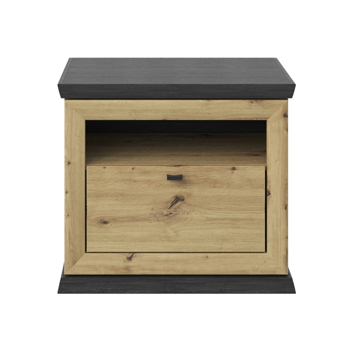 What sets the Benton bedside table apart is the unique design combining an artisan oak decor, faithfully reproducing the texture of natural wood, with a contrasting dark delios finish on the top and base. The warm colour scheme brings a relaxing and restful atmosphere to the interior, while the geometric milling on the drawer front adds a modern elegance to the piece.