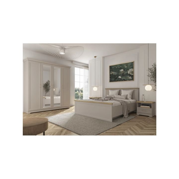 The Anga 94 cm chest of drawers is a piece of furniture that combines a subdued form with details that add character to the interior. The kashmir-coloured fronts, finished with delicate milling, refer to the trend of calm, pastel colours. The top in mauvella oak décor breaks the uniformity of the fronts, bringing a note of warmth inspired by nature into the arrangement. This is complemented by handles in brushed gold which add a subtle accent without dominating the form of the furniture.