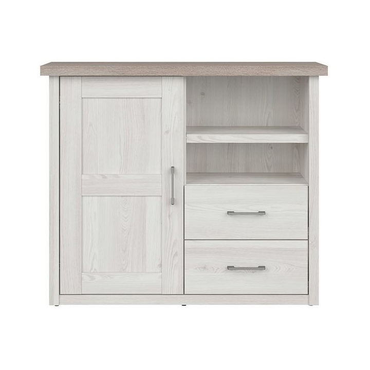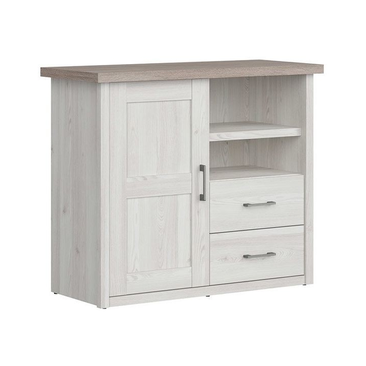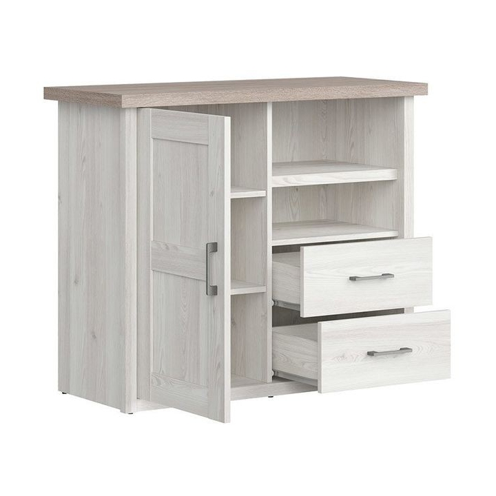 The furniture is distinguished by its subtle but distinctive design. The light-coloured body and fronts in light sibiu larch contrast with the top in dark sonoma oak. This combination creates a warm, friendly atmosphere and fits in with the principles of Scandinavian style - simplicity, functionality and natural colours.