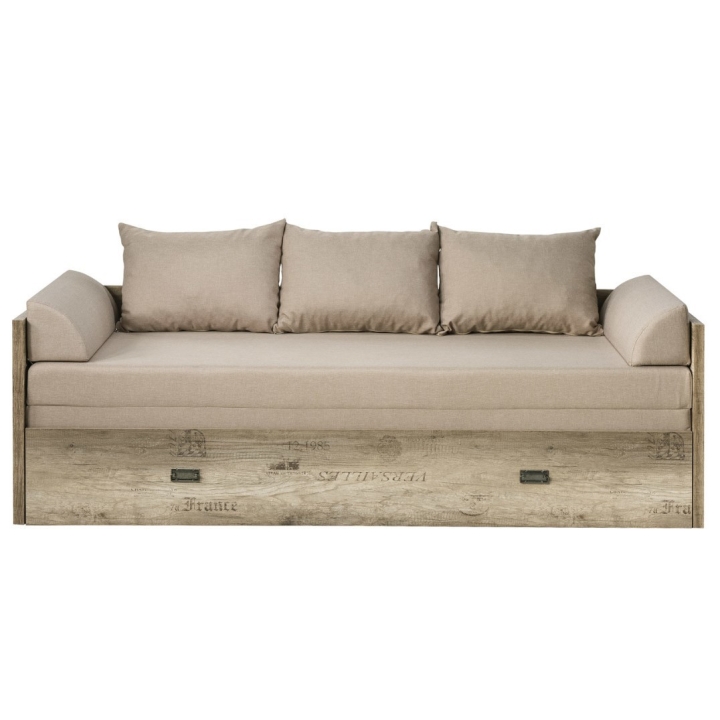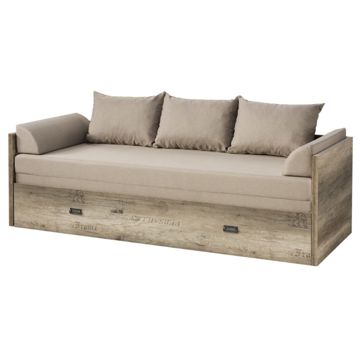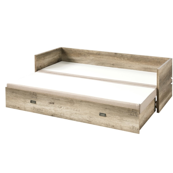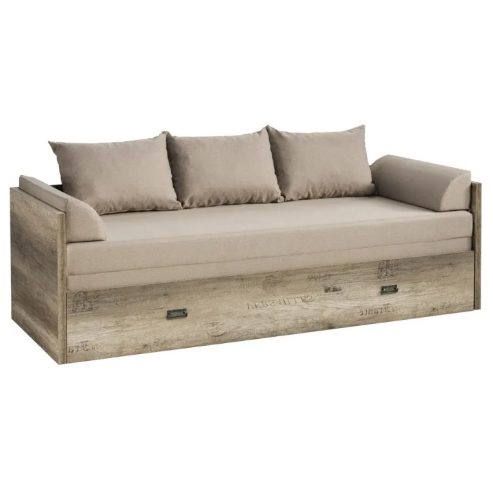 Bed 80/160 from the Malcolm collection by Black Red White. Malcolm bed is characterised by a solid construction and high quality workmanship, which ensures durability and stability. The bed requires the purchase of a dedicated mattress with a Carbo frame to function properly. The bed can be unfolded to provide more sleeping space. It has a bedding container for storing bed linen, blankets etc. Furniture in the colour of oak canyon monument , enriched on the drawer with a distinctive graphic accent in the form of letters.