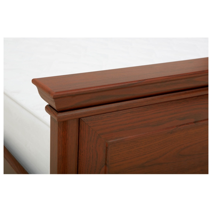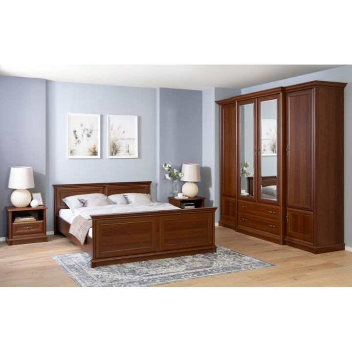 The bed frame is made of durable furniture board finished in chestnut veneer. The surface reproduces the grain of natural wood - with visible grain, variable texture and warm, deep colouring. There is no artificial gloss - it is pleasant to the touch and its appearance changes depending on the lighting in the room. It is details like this that create the mood of the interior.