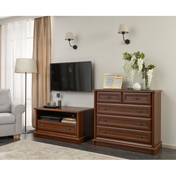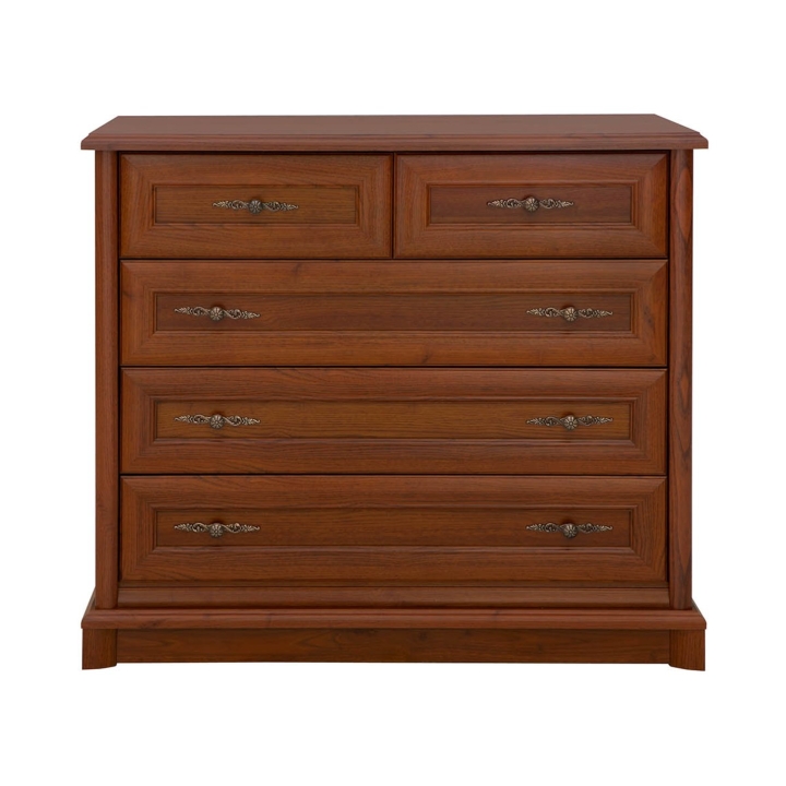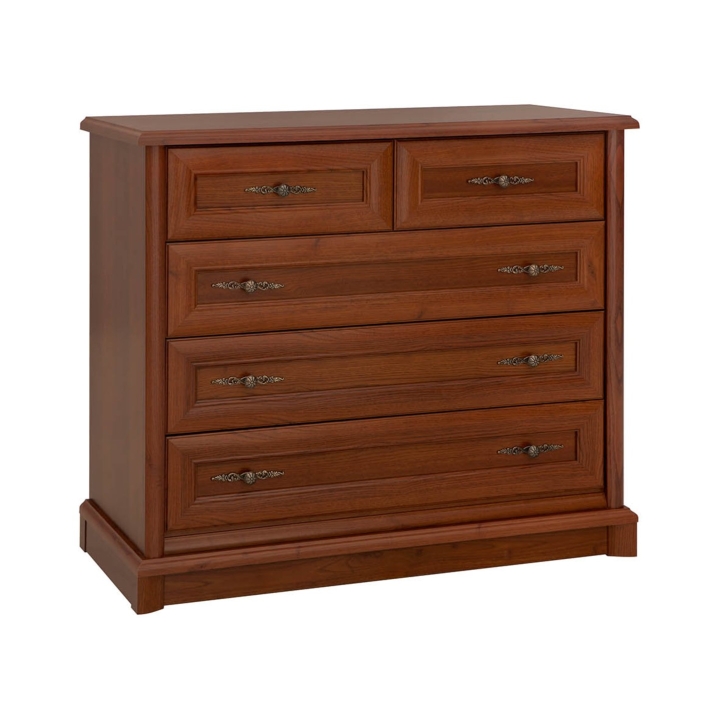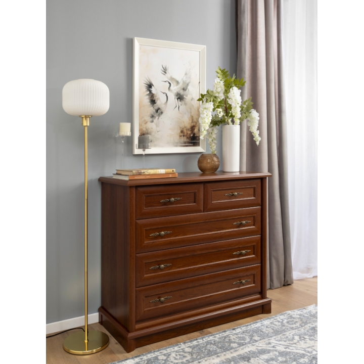 The Kent 5S chest of drawers is a classic 101 cm wide solid that is perfect for rooms where storage must go hand in hand with aesthetics. Its interior consists of five drawers: three larger and two smaller, arranged in the upper part. This division makes it possible to organise the contents logically and to sort items easily, from small accessories to larger textiles or documents.