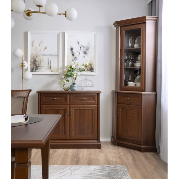 The appearance of the chest of drawers is complemented by carved plinths, milled fronts and jeweled handles in the colour of old gold. It is these details that bring a classic atmosphere to the interior - discreet but noticeable. The handles are comfortable and lie well in the hand, which translates into the comfort of everyday use.