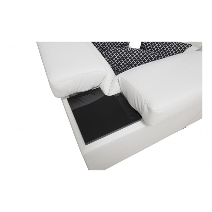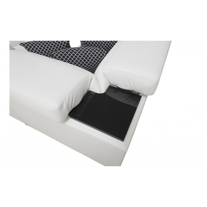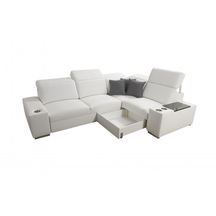 The structure incorporates 5 adjustable headrests, enabling the user to tailor the backrest to their preferred position. The corner sofa features 1 bedding container for added storage and an opening bar, providing space for small accessories. The entire piece is reinforced with a durable frame constructed from wood combined with chipboard.