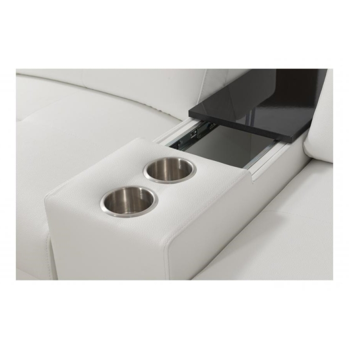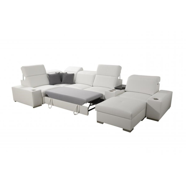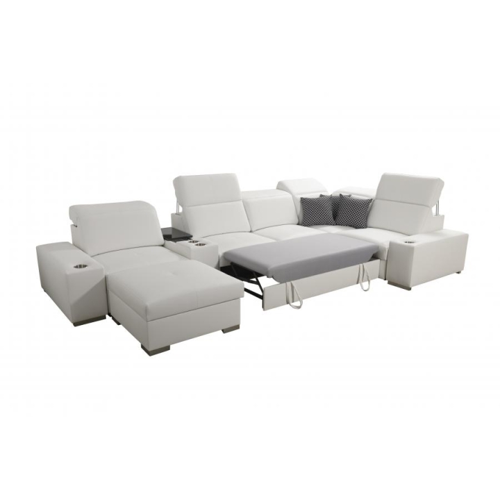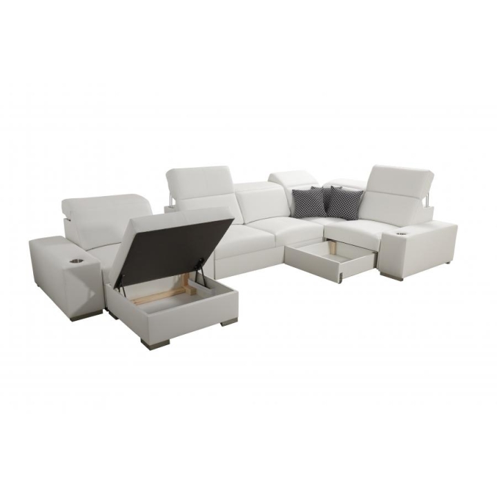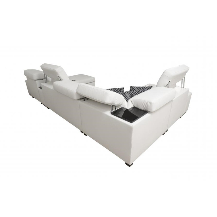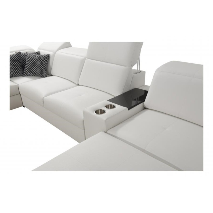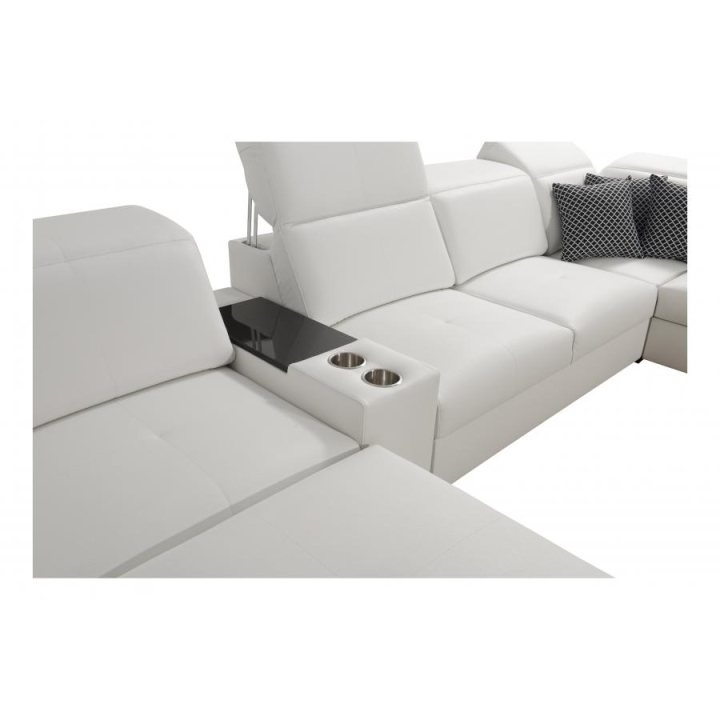 The pillows shown in the photo are included for free, and additional elements can be matched to the user’s taste. Cupholders are available in black or silver, while the shelves come in multiple variants: high-gloss lacquered laminate (white or black), laminate (oak Lancelot, silver venge, matt black satin), and wooden options in black, white, alder, beech, or venge. Thanks to the advanced configurator, the upholstery can be tailored to individual aesthetic preferences. A wide selection of fabrics with various textures, colors, and performance characteristics allows the sofa to fit seamlessly into any interior concept, offering both comfort and full visual personalization.
