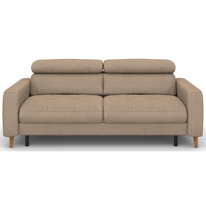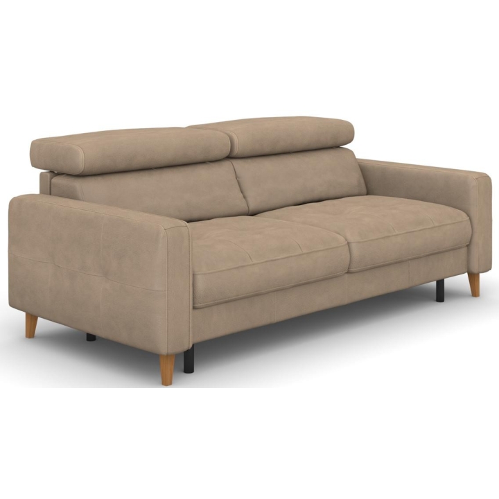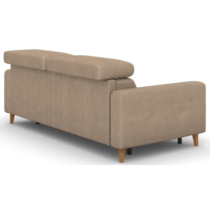 The sofa from the Goya collection by the Polish manufacturer Bydgoskie Meble is a harmonious combination of modern design and functionality. The seat is made of a combination of high-flexible foam and corrugated springs, while the backrest is made of elastic bands and polyurethane foam. The high quality materials used in the production of the furniture ensure that the user experiences the highest comfort of rest. The sofa can be used by a maximum of three people at a time; more people will reduce the comfort of use. An additional asset of the furniture are the adjustable headrests, which will ensure that every user will find a suitable and, above all, comfortable position for themselves. The furniture's dimensions: 198 cm wide, 84 cm high, 107 cm deep make it provide a suitable sleeping area of 190 x 140 cm, and the Italian-type sleeping function will ensure a comfortable sleep. The sofa is set on high wooden legs that add character to the overall design. An aspect that will appeal to lovers of personalisation is the fact that the colouring of the legs is available in as many as 7 colours: wenge, antique cherry, natural beech, natural oak, walnut, silver, black. In addition, a choice of over 600 fabrics, including leather, will ensure that even the most demanding customers will find something to suit their taste.