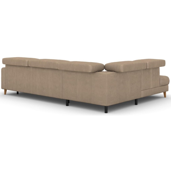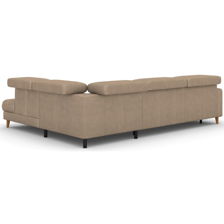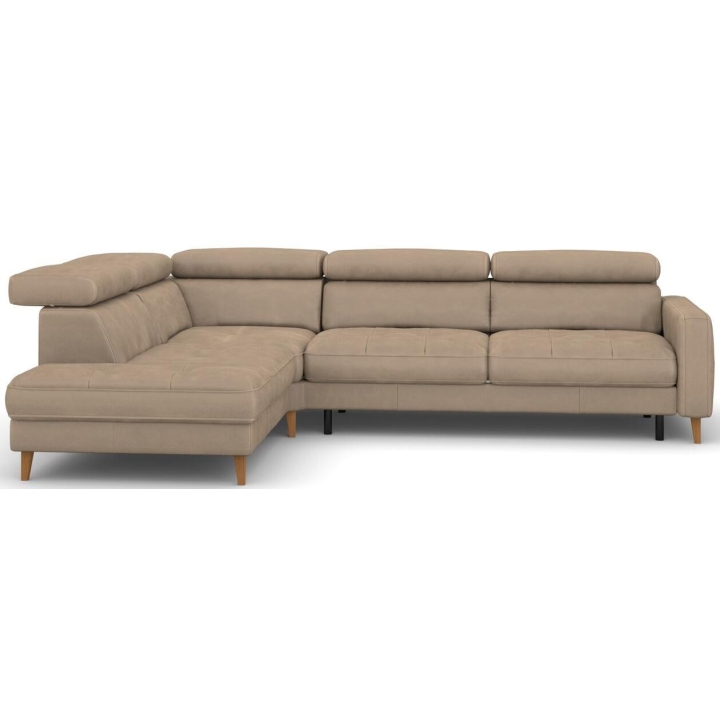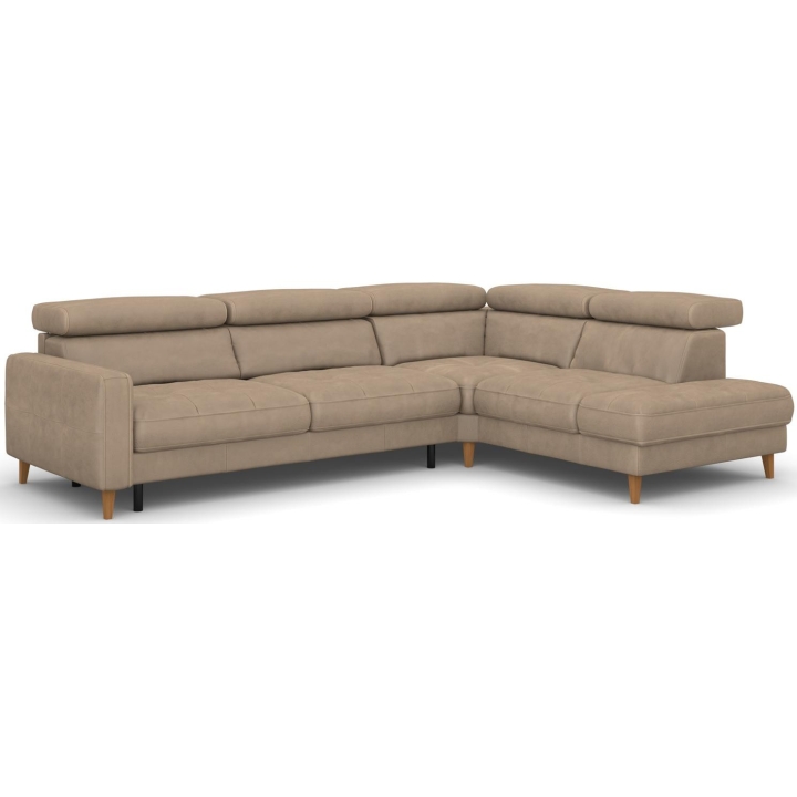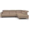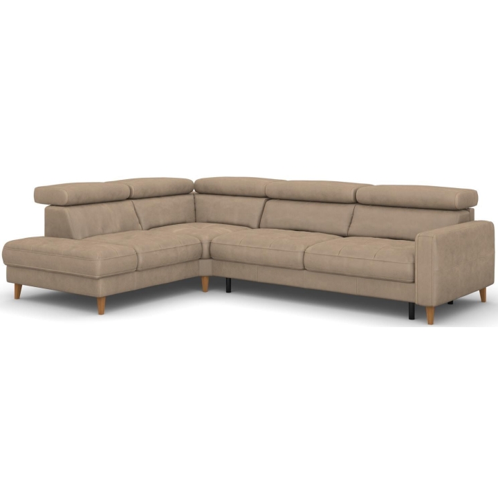 The modular sofa bed from the Goya collection by the Polish manufacturer Bydgoskie Meble is a harmonious combination of modern design and functionality. The seat is made of a combination of highly flexible foam and corrugated springs, while the backrest is made of elastic bands and polyurethane foam. The high quality materials used in the manufacture of the furniture make the user experience the highest comfort of rest. An additional asset of the furniture are the adjustable headrests, which will ensure that each user finds a suitable and, above all, comfortable position for themselves. The furniture's dimensions: 289 cm wide, 84 cm high, 230 cm deep make it provide an adequate sleeping area of 190 x 140 cm, and the Italian-type sleeping function will ensure a comfortable sleep. The sofa is set on high wooden legs that add character to the overall design. An aspect that will appeal to lovers of personalisation is the fact that the colouring of the legs is available in as many as 7 colours: wenge, antique cherry, natural beech, natural oak, walnut, silver, black. In addition, a choice of more than 600 fabrics, including leather, will ensure that even the most demanding customers will find something to their liking. Corner sofa with configuration: 3F(L/P)-TE-1,5HT/BK (L/P) can have a recliner on the left or right side.
