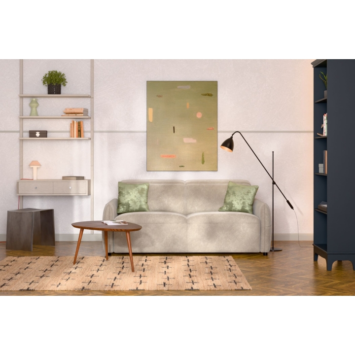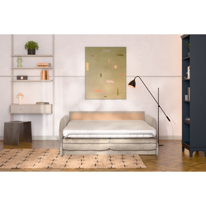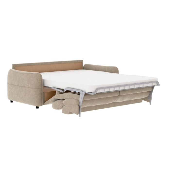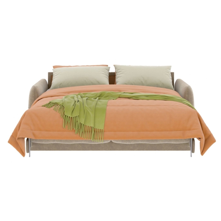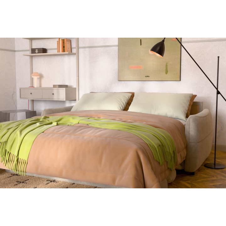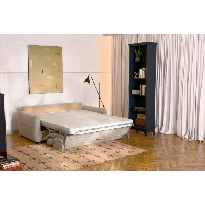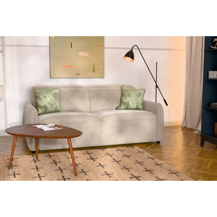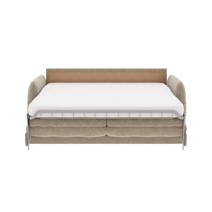 The sofa is equipped with an Italian-style sleeper function, based on a mattress placed on spring slats. The sleeping surface measures 140 × 200 cm, providing ample space for nighttime rest. The unfolding mechanism has been designed to operate smoothly and stably.