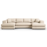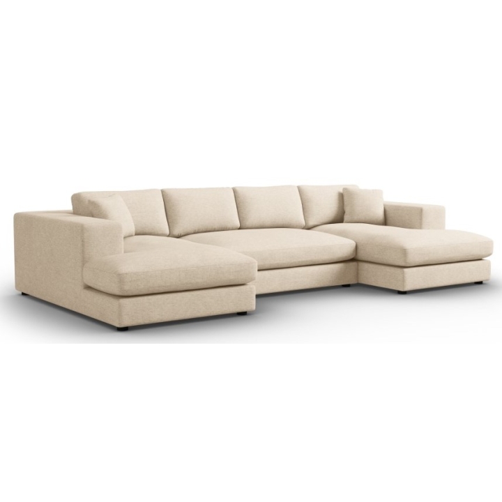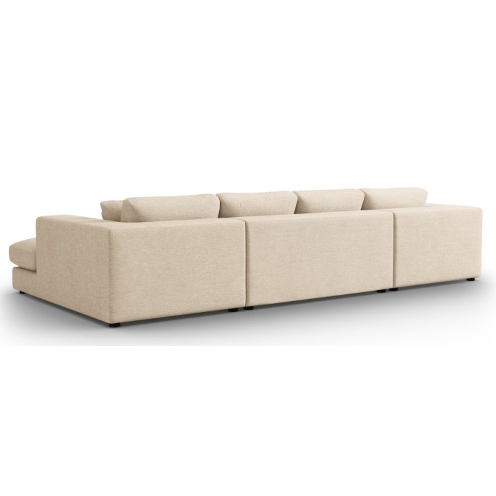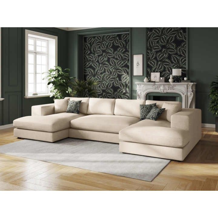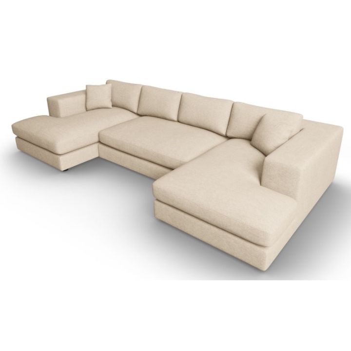 The dimensions of the sofa are 344 cm long, 170 cm wide on both sides and 72 cm high, making it suitable for spacious living rooms. The sofa is equipped with two symmetrical chaise longues on the edges, each 104cm wide and 170cm long. The seat height of 40cm allows for comfortable seating and relaxation. This solution provides extra spaciousness and comfort, ideal for relaxing. The black colour of the sofa legs blends perfectly with all fabric colours. The height of the legs is 2 cm, which gives the furniture a modern character.