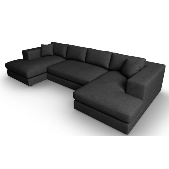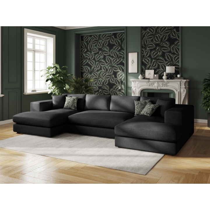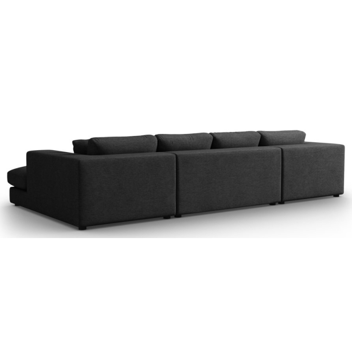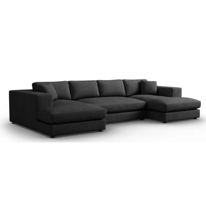 The dimensions of the sofa are 344 cm long, 170 cm wide on both sides and 72 cm high, making it suitable for spacious living rooms. The sofa is equipped with two symmetrical chaise longues on the edges, each 104cm wide and 170cm long. The seat height of 40cm allows for comfortable seating and relaxation. This solution provides extra spaciousness and comfort, ideal for relaxing. The black colour of the sofa legs blends perfectly with all fabric colours. The height of the legs is 2 cm, which gives the furniture a modern character.