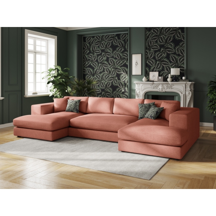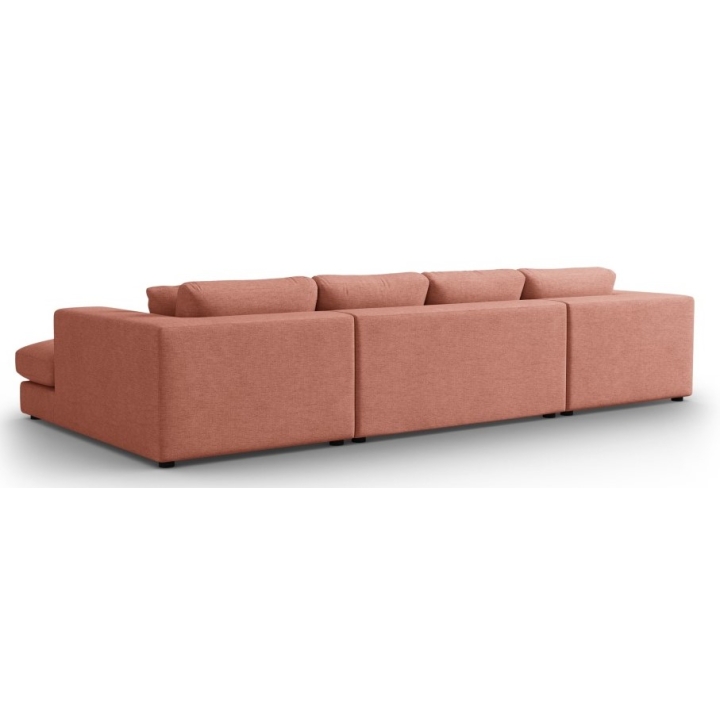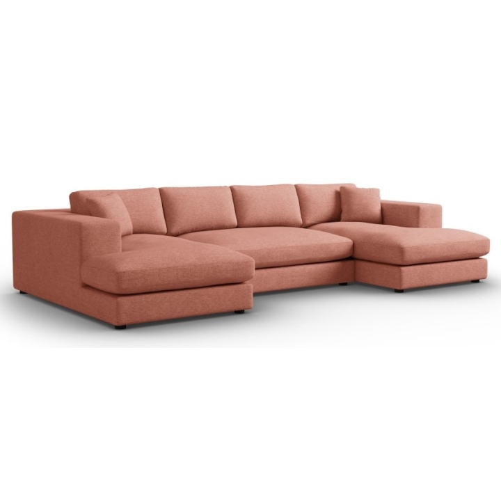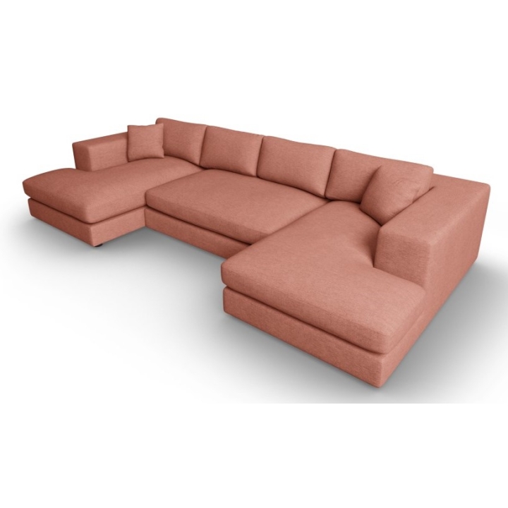 The dimensions of the sofa are 344 cm long, 170 cm wide on both sides and 72 cm high, making it suitable for spacious living rooms. The sofa is equipped with two symmetrical chaise longues on the edges, each 104cm wide and 170cm long. The seat height of 40cm allows for comfortable seating and relaxation. This solution provides extra spaciousness and comfort, ideal for relaxing. The black colour of the sofa legs blends perfectly with all fabric colours. The height of the legs is 2 cm, which gives the furniture a modern character.