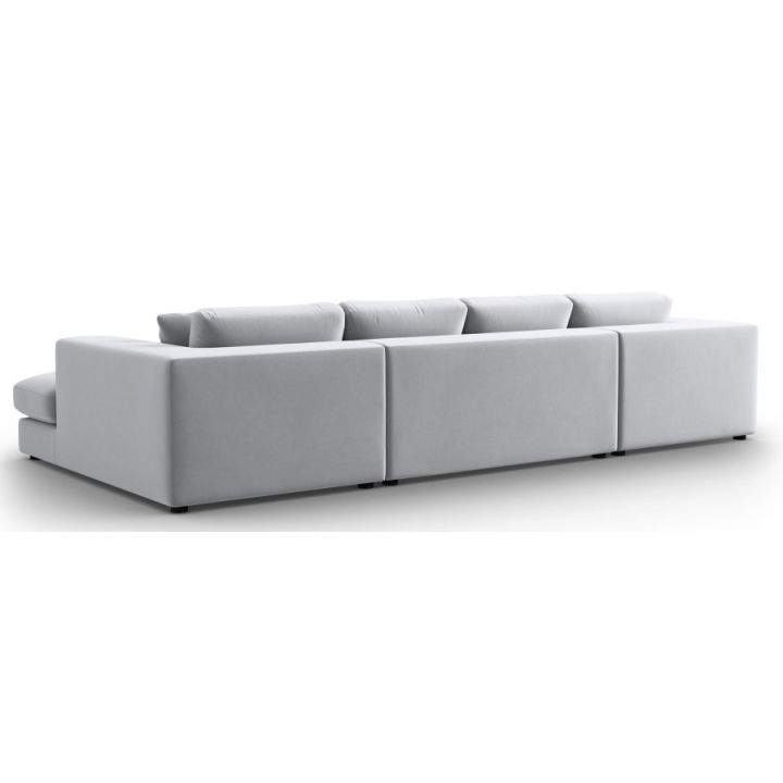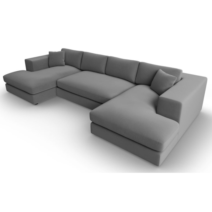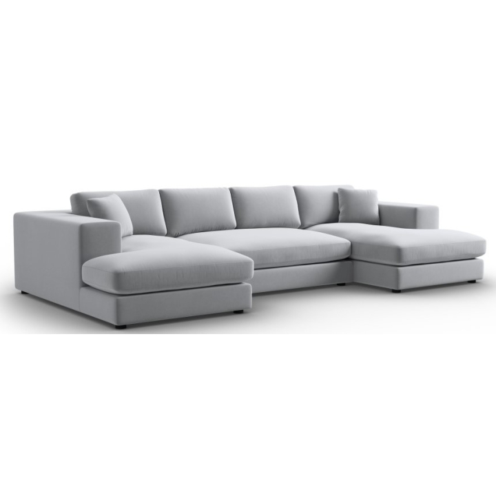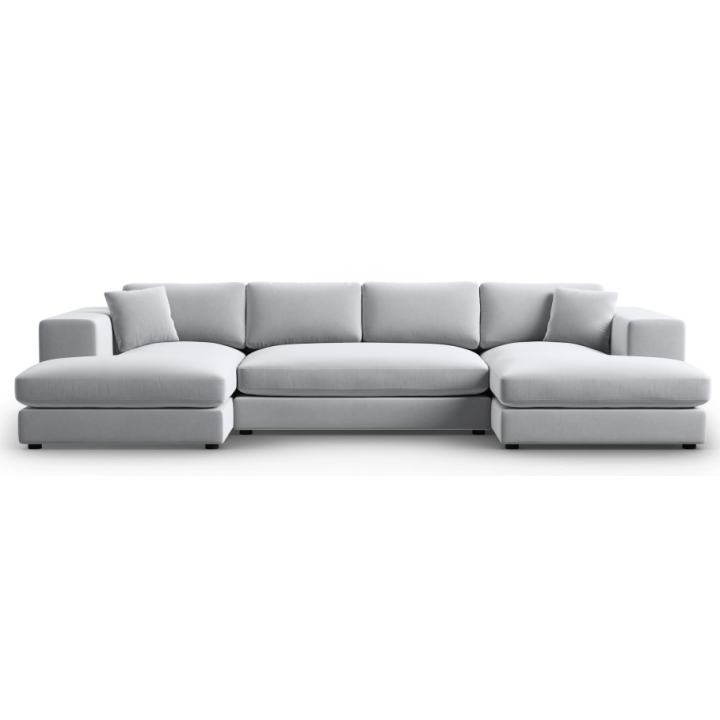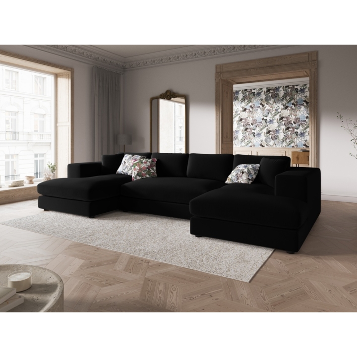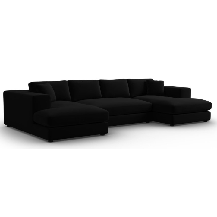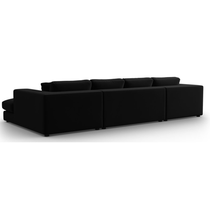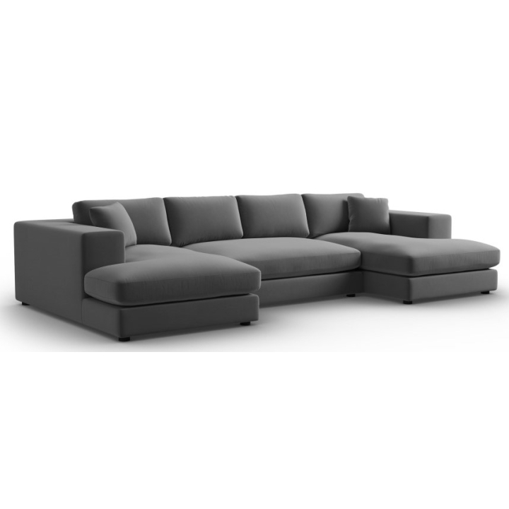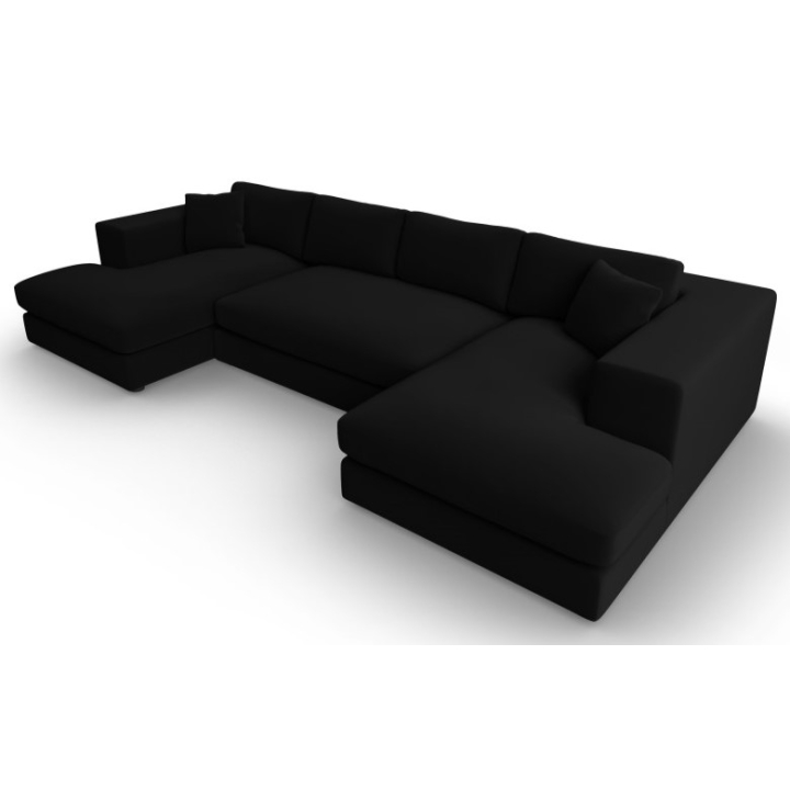 The sofa has been designed with spacious interiors in mind, providing comfort for five people thanks to its dimensions of 344 cm long, 170 cm wide and 72 cm high. In addition, the sofa is equipped with two symmetrical chaise lounges positioned on the edges, each 104 cm wide and with a seat height of 40 cm, providing additional space for lounging. The armrests are 61 cm high and 32 cm wide. The legs of the sofa, made in black, are 2 cm high, adding subtlety to the overall design. The whole is based on solid springs, which guarantees durability and the combination of polyurethane foam with silicone and latex maximum comfort.