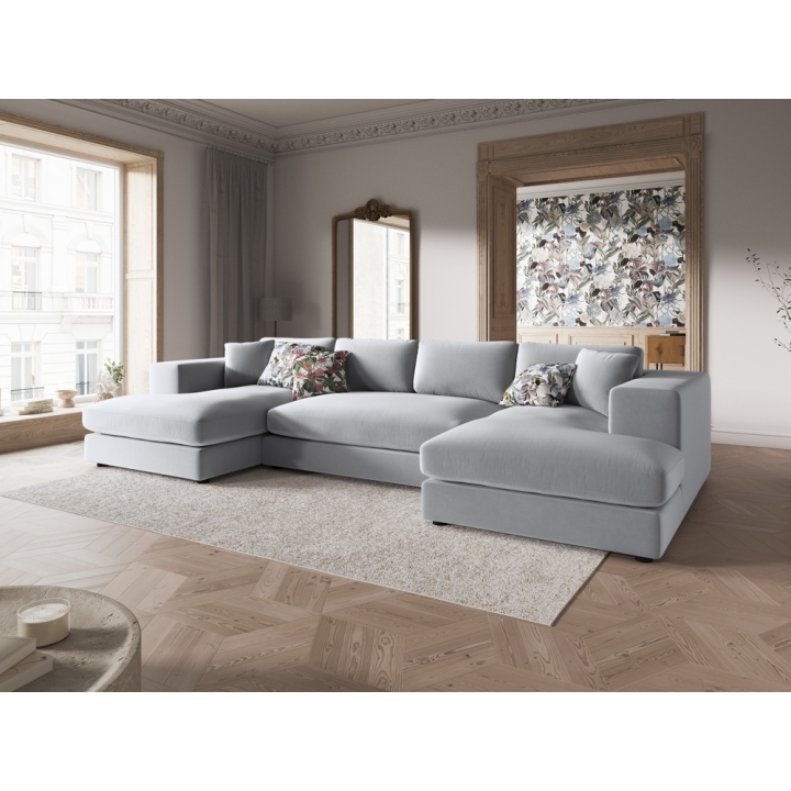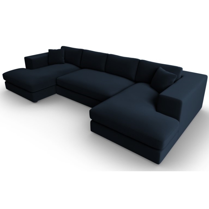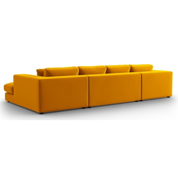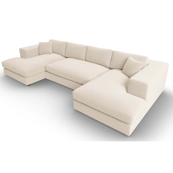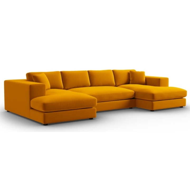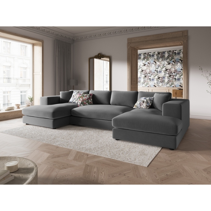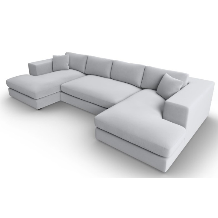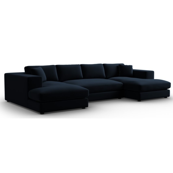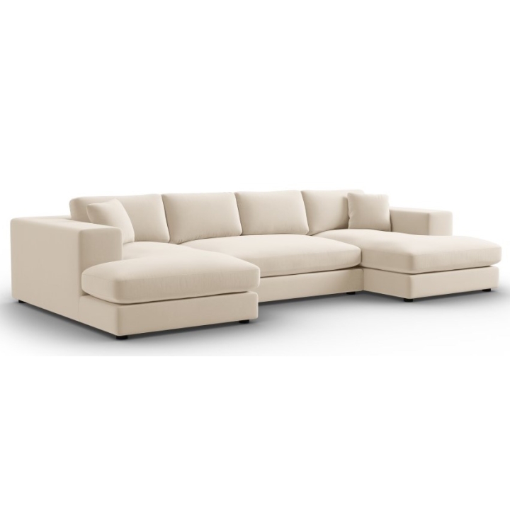 The sofa has been designed with spacious interiors in mind, providing comfort for five people thanks to its dimensions of 344 cm long, 170 cm wide and 72 cm high. In addition, the sofa is equipped with two symmetrical chaise lounges positioned on the edges, each 104 cm wide and with a seat height of 40 cm, providing additional space for lounging. The armrests are 61 cm high and 32 cm wide. The legs of the sofa, made in black, are 2 cm high, adding subtlety to the overall design. The whole is based on solid springs, which guarantees durability and the combination of polyurethane foam with silicone and latex maximum comfort.