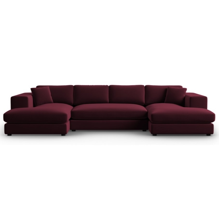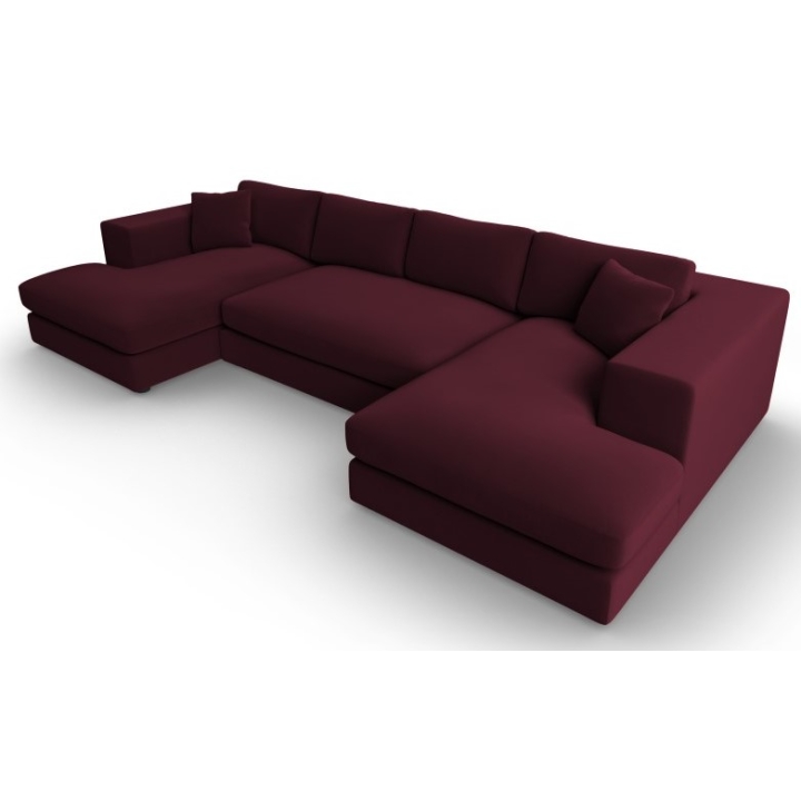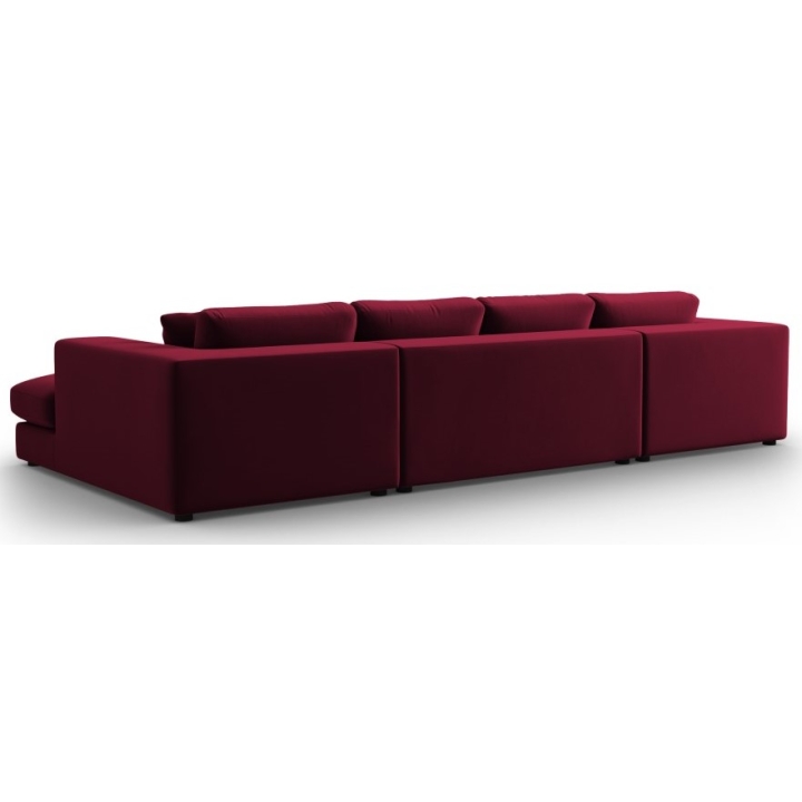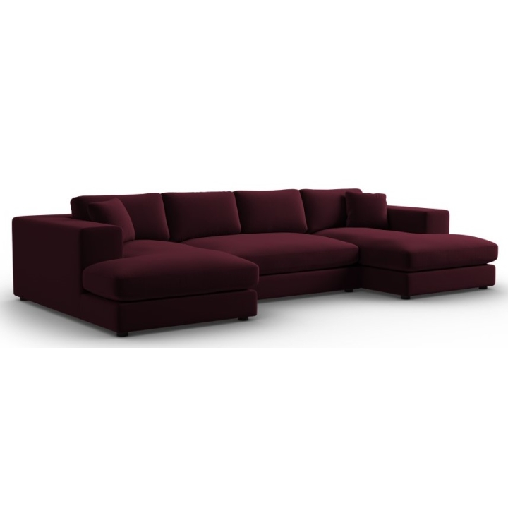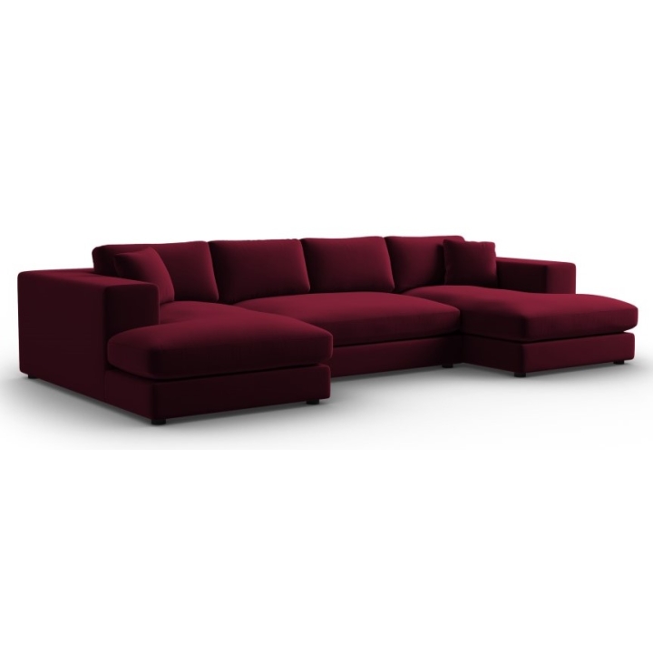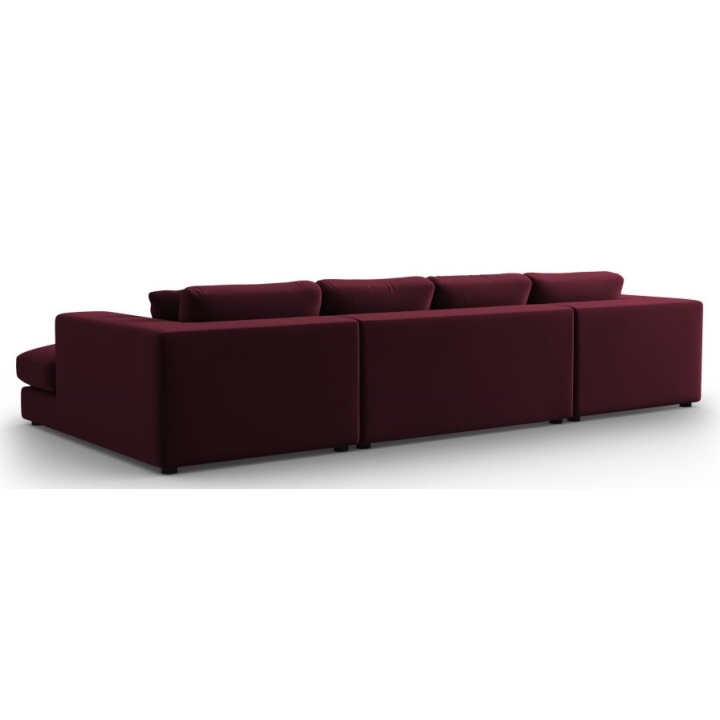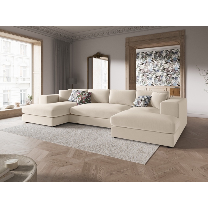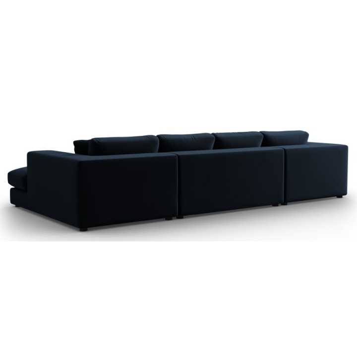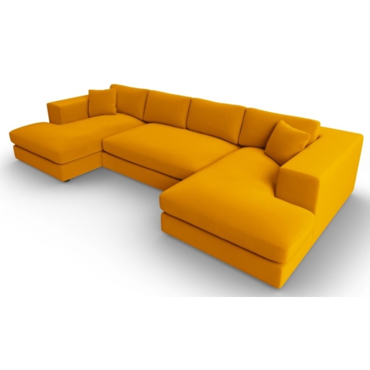 The sofa has been designed with spacious interiors in mind, providing comfort for five people thanks to its dimensions of 344 cm long, 170 cm wide and 72 cm high. In addition, the sofa is equipped with two symmetrical chaise lounges positioned on the edges, each 104 cm wide and with a seat height of 40 cm, providing additional space for lounging. The armrests are 61 cm high and 32 cm wide. The legs of the sofa, made in black, are 2 cm high, adding subtlety to the overall design. The whole is based on solid springs, which guarantees durability and the combination of polyurethane foam with silicone and latex maximum comfort.