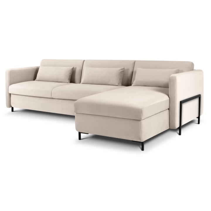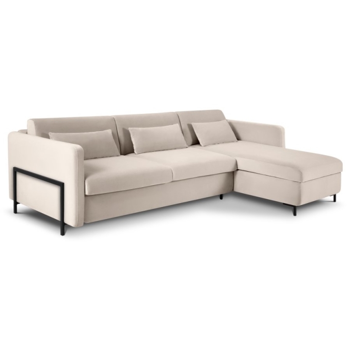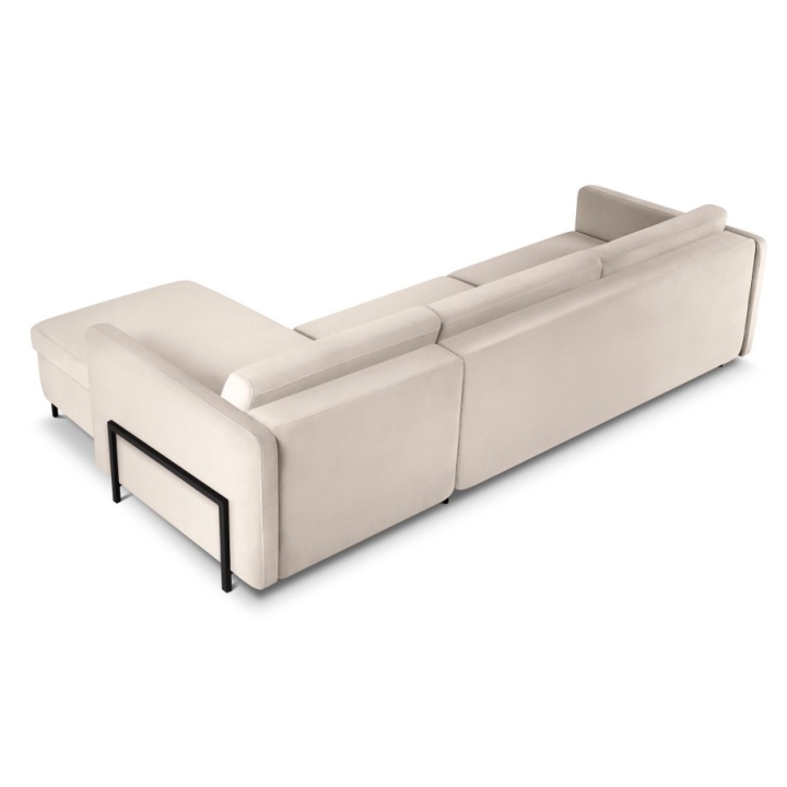 The solid pine wood frame and black metal legs 10 cm high emphasise the unique character of the furniture. Three backrest cushions and three under-arm cushions filled with Foam Crisp and silicone add to the comfort. The Yanis Welur corner sofa is a luxurious piece of furniture that will be perfect for modern interiors.