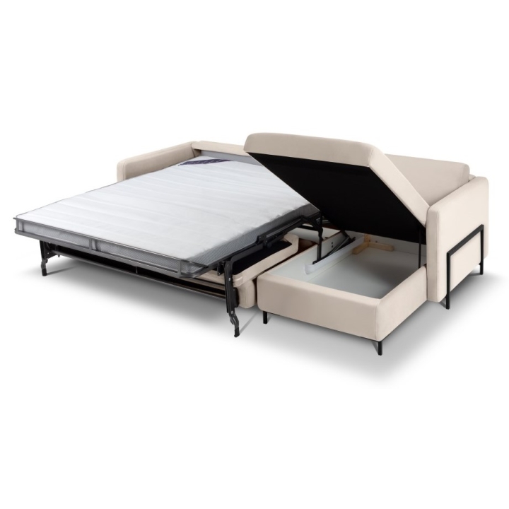 The Yanis Christian Lacroix 5-seater corner sofa with sleeping function in velour is a proposal for lovers of beauty and luxury. The corner sofa's modern design will blend perfectly into your living room, offering both comfort and aesthetics. The design, available in left- or right-handed versions, allows it to fit into any interior, and the wide choice of velour fabric colours offers many personalisation possibilities. A sleeping function with a 205x160 cm surface and a bedding container in the chaise longue (134x77x20) make the corner sofa a practical solution.