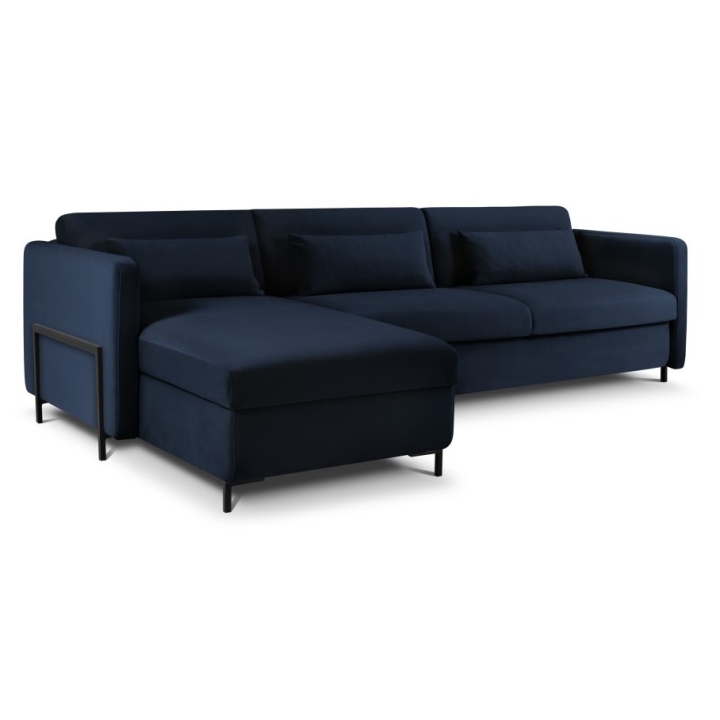 The solid pine wood frame and black metal legs 10 cm high emphasise the unique character of the furniture. Three backrest cushions and three under-arm cushions filled with Foam Crisp and silicone add to the comfort. The Yanis Welur corner sofa is a luxurious piece of furniture that will be perfect for modern interiors.