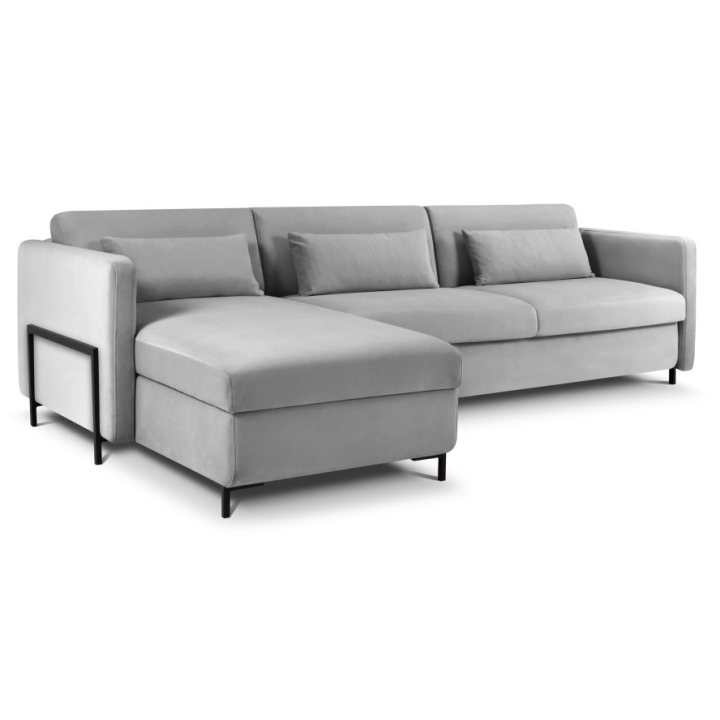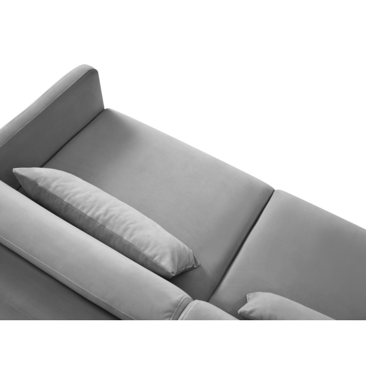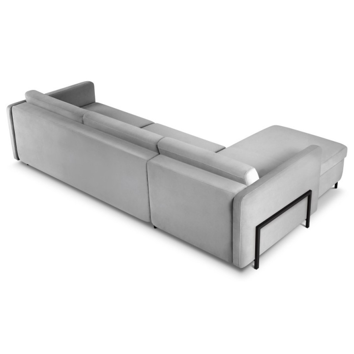 The solid pine wood frame and black metal legs 10 cm high emphasise the unique character of the furniture. Three backrest cushions and three under-arm cushions filled with Foam Crisp and silicone add to the comfort. The Yanis Welur corner sofa is a luxurious piece of furniture that will be perfect for modern interiors.