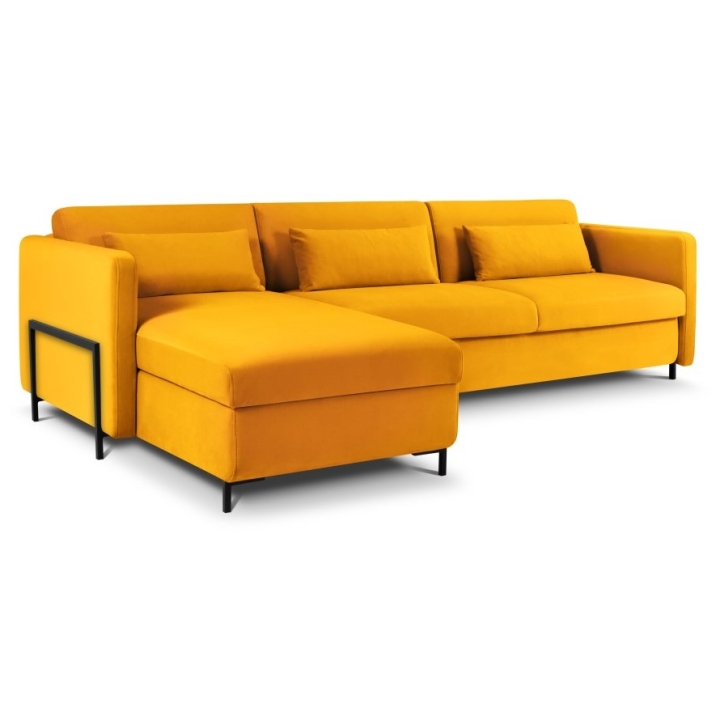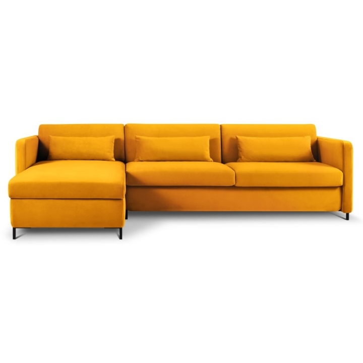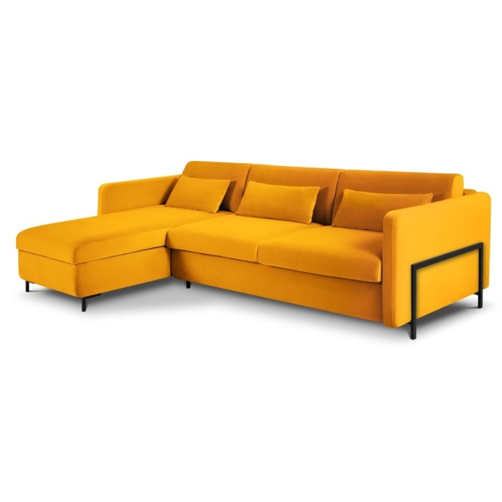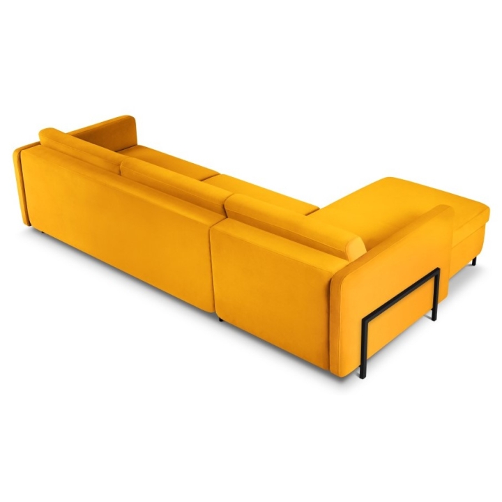 The solid pine wood frame and black metal legs 10 cm high emphasise the unique character of the furniture. Three backrest cushions and three under-arm cushions filled with Foam Crisp and silicone add to the comfort. The Yanis Welur corner sofa is a luxurious piece of furniture that will be perfect for modern interiors.