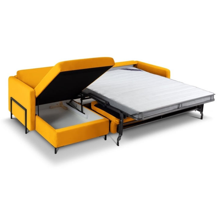 The Yanis Christian Lacroix 5-seater corner sofa with sleeping function in velour is a proposal for lovers of beauty and luxury. The corner sofa's modern design will blend perfectly into your living room, offering both comfort and aesthetics. The design, available in left- or right-handed versions, allows it to fit into any interior, and the wide choice of velour fabric colours offers many personalisation possibilities. A sleeping function with a 205x160 cm surface and a bedding container in the chaise longue (134x77x20) make the corner sofa a practical solution.
