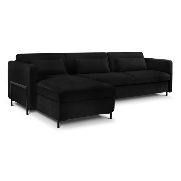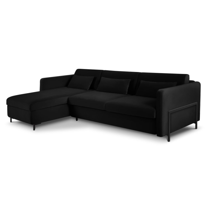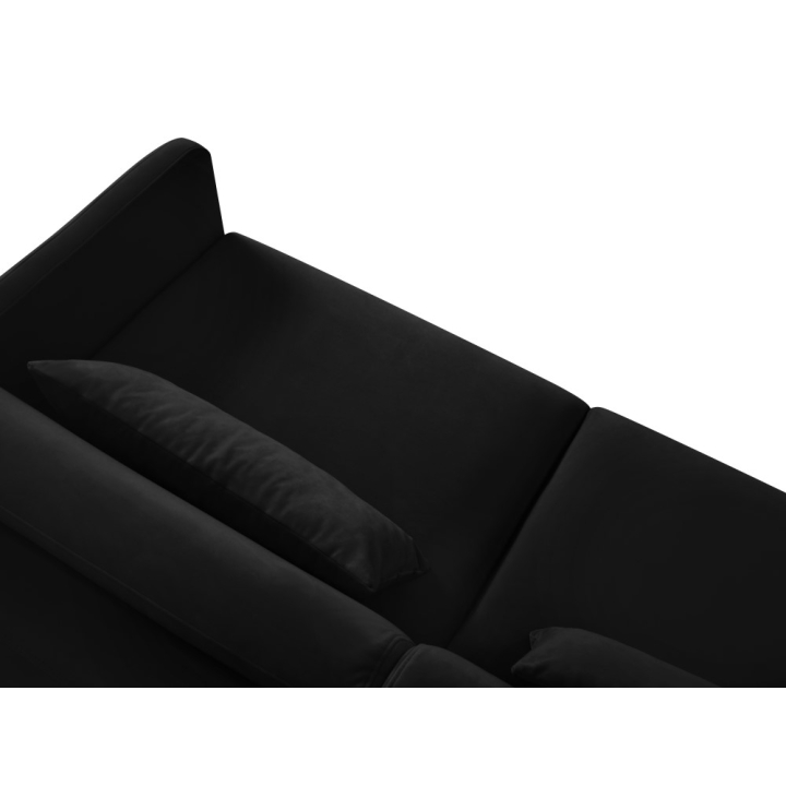 The solid pine wood frame and black metal legs 10 cm high emphasise the unique character of the furniture. Three backrest cushions and three under-arm cushions filled with Foam Crisp and silicone add to the comfort. The Yanis Welur corner sofa is a luxurious piece of furniture that will be perfect for modern interiors.